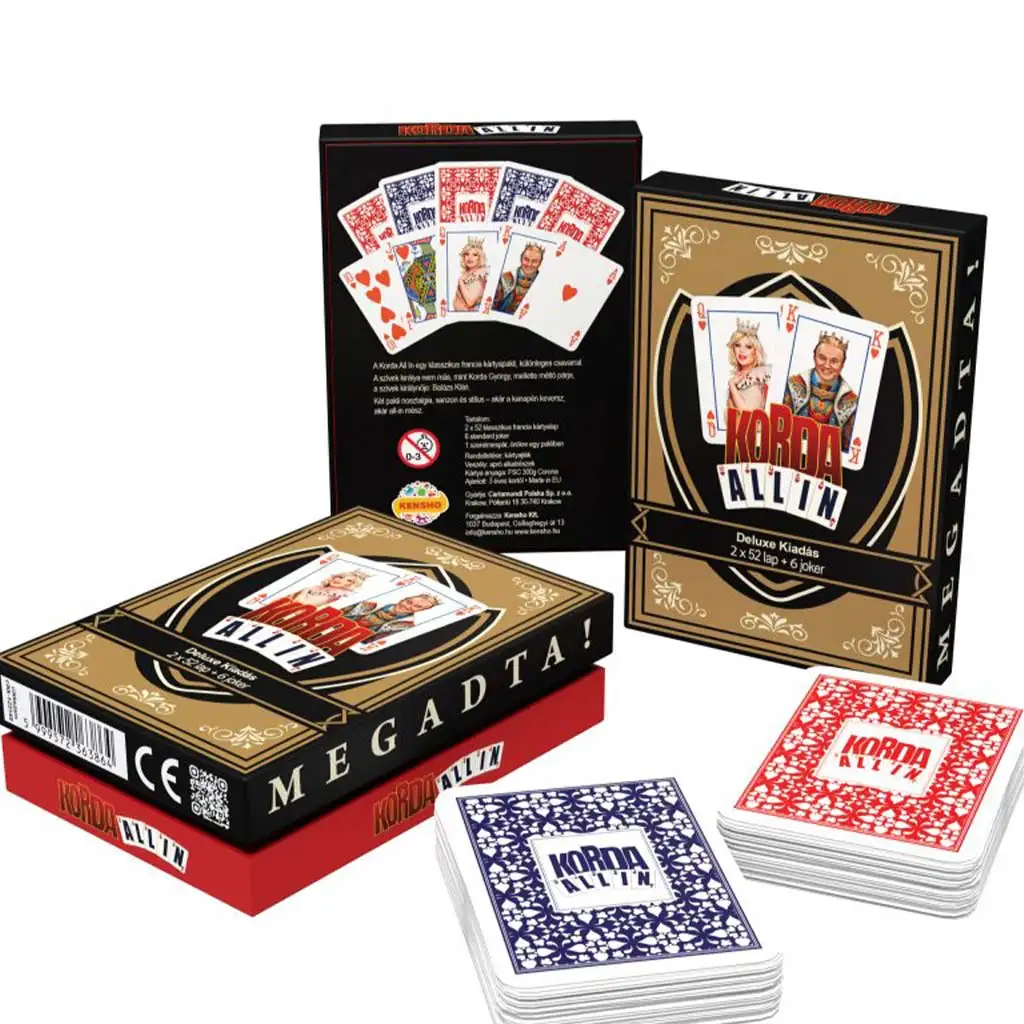 Korda All-In Deluxe francuski dvostruki špil karata (2×52 karte + 6 džokera) pravi je dragulj klasičnog kartaškog igranja, koji ne donosi samo radost igre, već i stil i humor za stol. Ovo posebno, premium izdanje sadrži dva kompletna francuska špila s ukupno 104 karte i 6 džokera, što ga čini idealnim izborom za veća društva ili duže, ozbiljnije partije – bilo da se radi o pokeru, remiju, makau ili bilo kojoj drugoj popularnoj igri.
