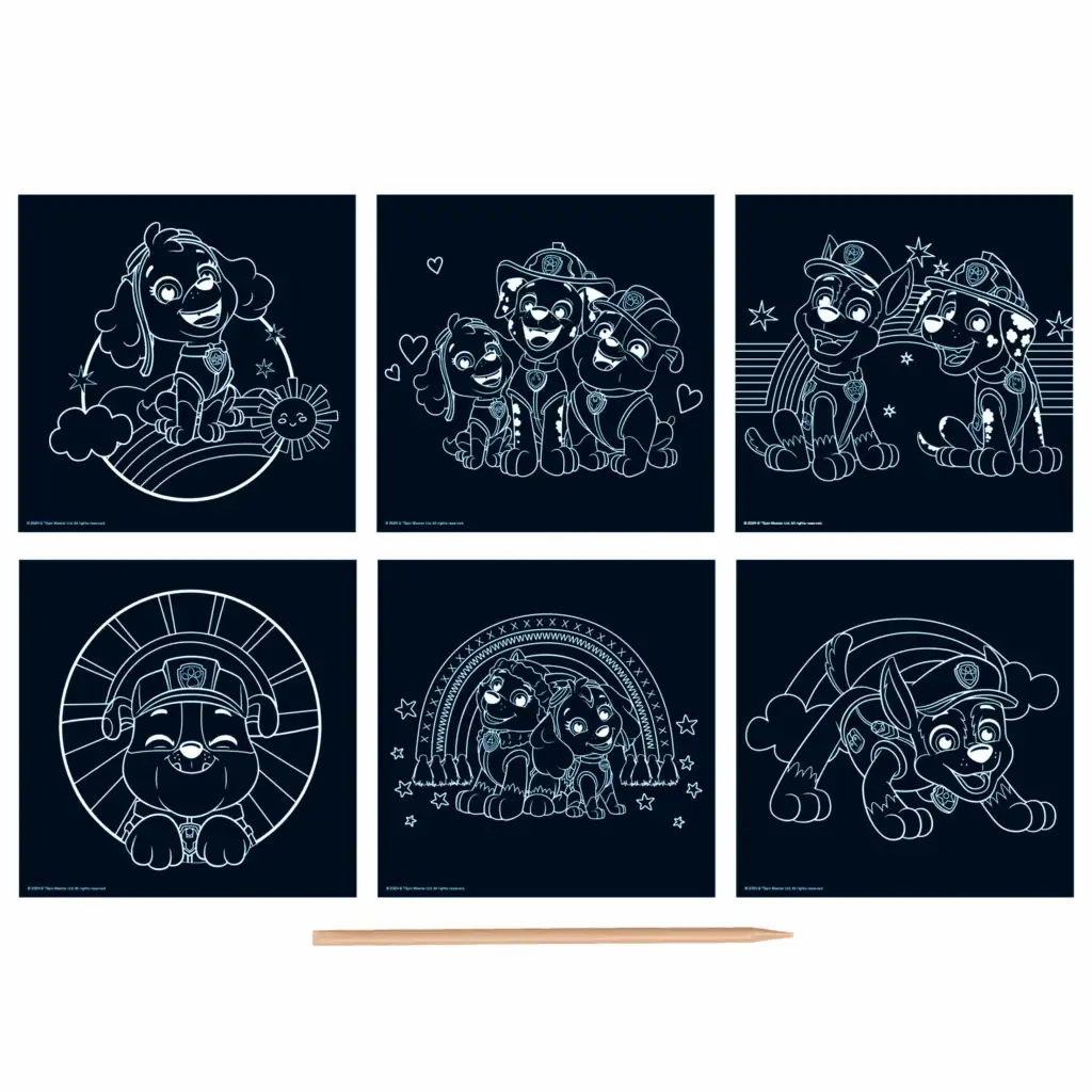 - 6 unaprijed nacrtanih crnih ogrebotinskih slika s likovima iz Paw Patrola