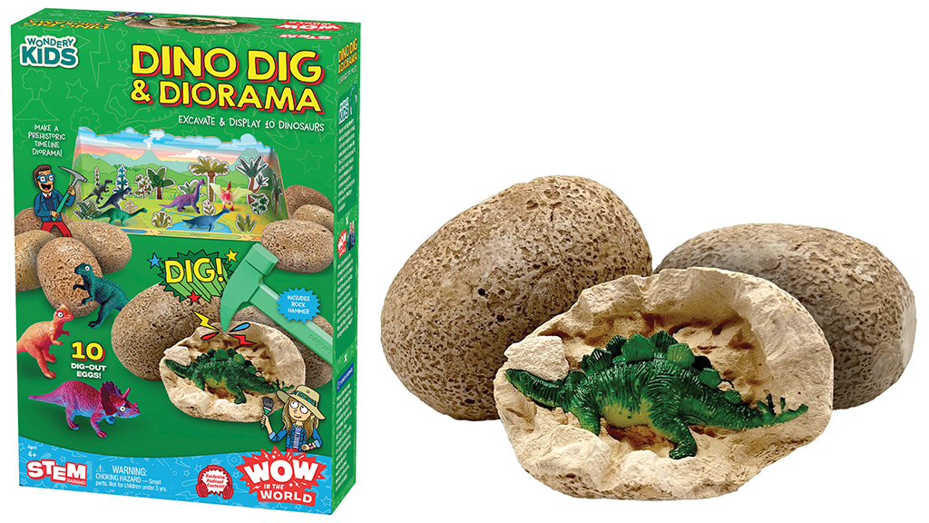 Teleskop ima kvalitetne leće, podesivu širinu, mekane očne školjke i kotačić za fokusiranje. Osamstrani priručnik prati napredak djece tijekom lova na prirodoslovno blago, dok slušaju vođeni vanjski obilazak s voditeljima emisije Wow in the World, Guy Razom i Mindy Thomas. Ovaj teleskop ne samo da čini otkrivanje prirode uzbudljivim, već također pomaže djeci u učenju dok na zabavan način upoznaju svoju okolinu.Set sadrži 10 jaja kroz koja se može kopati kako bi se otkrile figure dinosaura. Djeca mogu sastaviti kartonsku dioramu kako bi stvorila izložbu dinosaura u muzeju. Ova aktivnost nije samo zabavna, već i edukativna, jer djeca mogu upoznati svijet dinosaura dok razvijaju svoju spretnost i kreativnost. Set može biti idealan izbor za rođendanski poklon ili zajednički obiteljski program.