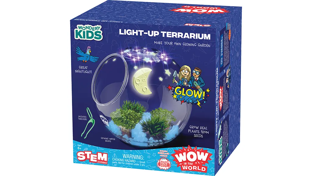 Zbirka je dostupna na sljedećim poveznicama i kod odabranih trgovaca, kao što je Barnes & Noble. Želimo vam dobru zabavu — u ime znanosti!Komplet sadrži sjemenke potočarke, "posude za rast", "zvijezde koje svijetle u mraku", svjetleće plastične kamenčiće, UV LED svjetlosni lanac i umjetne biljke. Mladi botaničari mogu slijediti eksperimentalni vodič kako bi izgradili terarij i učili o biljkama. Ovaj komplet nije samo zabavan, već i edukativan, jer djeca mogu naučiti o procesu rasta biljaka, fotosintezi i utjecajima okolišnih čimbenika. Svjetleći elementi daju terariju poseban ugođaj, tako da djeca mogu uživati u pogledu na svoj mali vrt i noću.