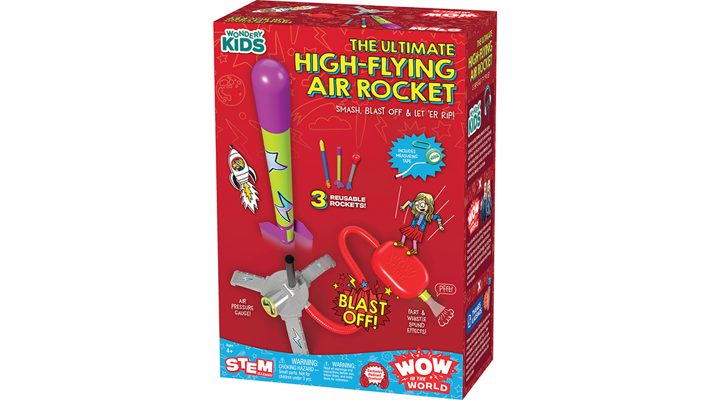 Thames & Kosmos surađuje s Wondery Kids na stvaranju nove linije proizvoda inspirirane dječjim znanstvenim podcastom Wow in the World. Ova raketa na zračni pogon dolazi s priručnikom za eksperimente koji pomaže djeci u postavljanju lansirne stanice i uzbudljivom lansiranju. Priručnik pruža detaljne upute za sastavljanje rakete, pridržavanje sigurnosnih propisa i izvođenje raznih znanstvenih eksperimenata kroz koje djeca mogu na zabavan način učiti o osnovnim načelima fizike. Ovaj proizvod nije samo zabavan, već i edukativan, potičući mlade na interes za znanost i kreativno razmišljanje.