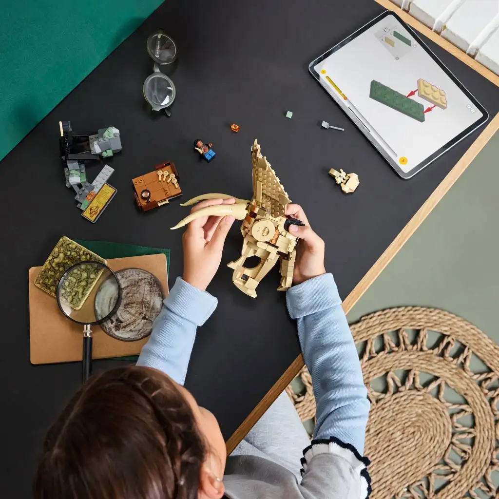 Podesiva Triceratops lubanja – Lubanja za djecu može imati otvorenu ili zatvorenu čeljust, a možeš odlučiti hoćeš li je izložiti na postolju ili s minifigurom, osnovnom pločom za iskopavanje, mini nalazima i alatima za iskopavanje.