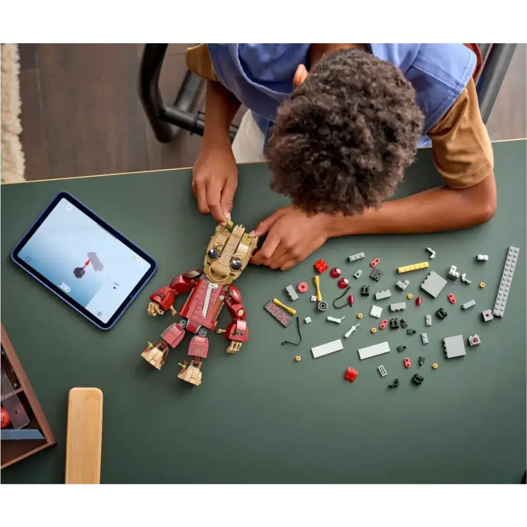 Ovaj kolekcionarski LEGO ǀ Marvel proizvod prikazuje Groota u odori Pljačkaša, baš kao što smo ga vidjeli u Marvel Studios filmu Čuvari galaksije vol. 2. Sastavljiva figura dolazi s detonatorom opremljenim s 2 gumba i 2 pokretne ruke, što je referenca na jednu od ikoničnih scena iz filma. Figura se može postaviti u brojne položaje zahvaljujući zglobovima na ramenima, rukama, prstima, bokovima, stopalima i vratu te podesivim obrvama kako bi se izraz lica mogao mijenjati. Ovaj LEGO ǀ Marvel građevinski set odlična je ideja za rođendanski poklon. Uz aplikaciju LEGO Builder djeca mogu samouvjereno graditi: mogu povećavati i okretati modele u 3D-u i pratiti svoj napredak putem preglednih digitalnih uputa. Set sadrži 604 dijela.