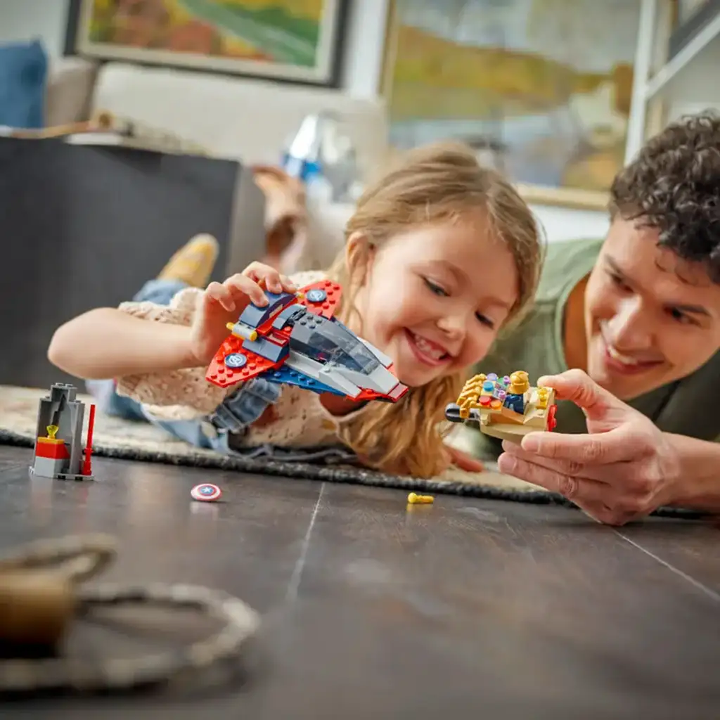 Ova igračka za slaganje i igru sadrži 2 figurice: Thanosa u svemirskom brodu inspiriranom Beskonačnom Rukavicom, s pomičnim "prstima" i bacačem raketa; i Kapetana Ameriku u cool Quinjeta s 2 bacača, kabinom koja se može otvoriti i prostorom za spremanje štita. Maštovitu igru potiče poseban element – kozmički kamen kojeg Kapetan Amerika pokušava zaštititi, a Thanos želi osvojiti. Svaka vrećica sadrži kockice za gradnju i veliku početničku kocku, tako da se modeli i likovi mogu brzo sastaviti i igra može odmah početi. Intuitivne upute sadržane su u šarenoj knjižici. Set ima ukupno 107 dijelova.