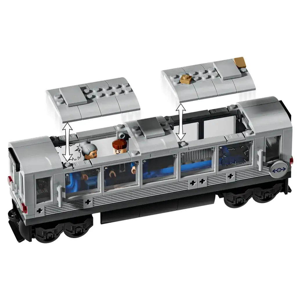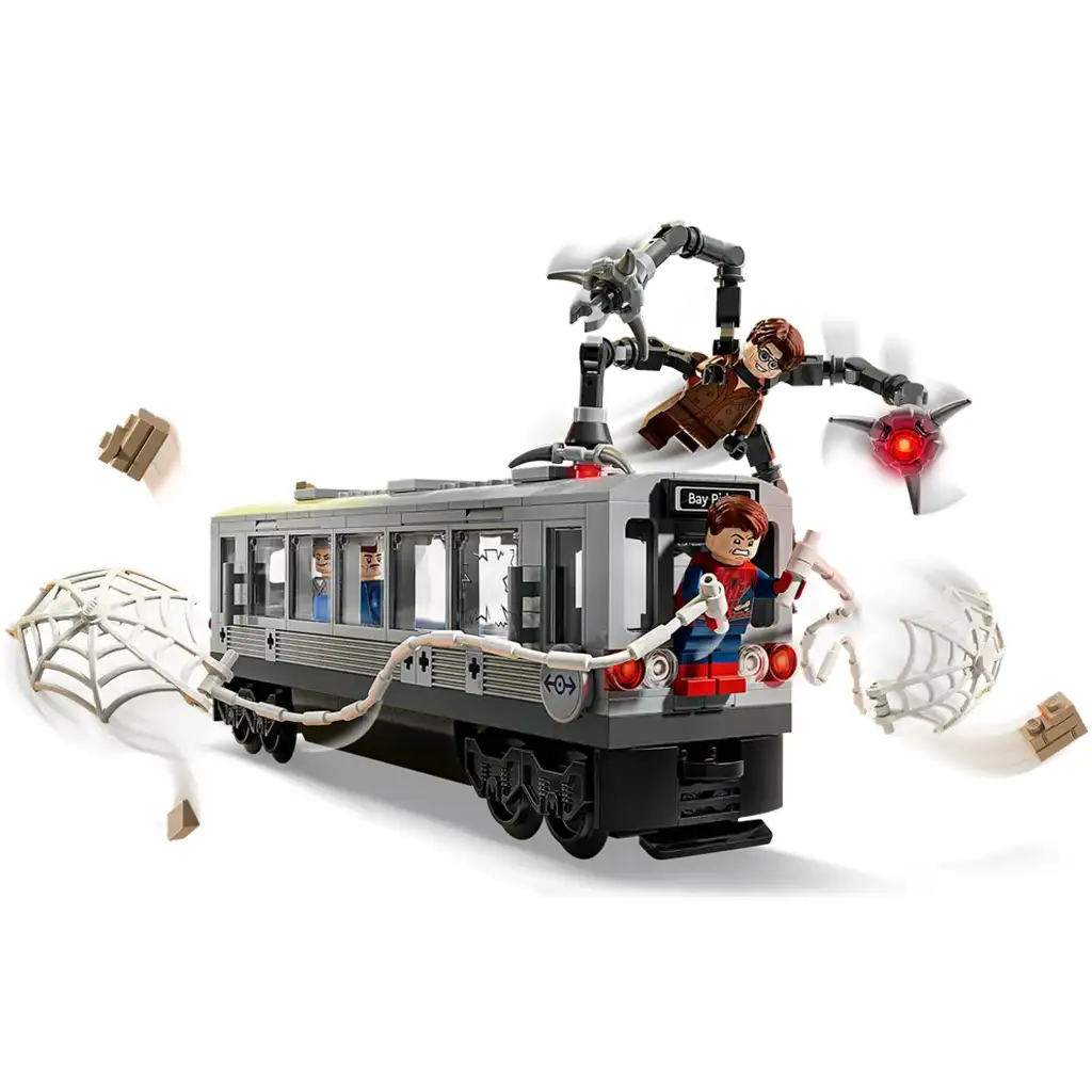 Ovaj superjunački set metroa temelji se na jednoj od kultnih scena iz Marvelovog filma Spider-Man 2. Set uključuje 4 minifigure: J. Jonah Jameson, teta May, Spider-Man i Doc Ock. Spider-Man minifigura ima zamjenjive glave (s maskom i bez maske), a na vagon možeš pričvrstiti veliku mrežu. Doc Ock minifigura ima 4 zglobne pipke, od kojih su dva opremljena "laserskim zrakama", a druga dva se mogu pričvrstiti na vagon metroa. Odvojivi krov omogućuje pristup unutrašnjosti vagona gdje može sjediti i putovati minifigura. Za dodatno digitalno iskustvo graditelji mogu povećavati i rotirati modele u 3D-u te pratiti svoj napredak u intuitivnoj LEGO Builder aplikaciji. Set sadrži 393 dijela.