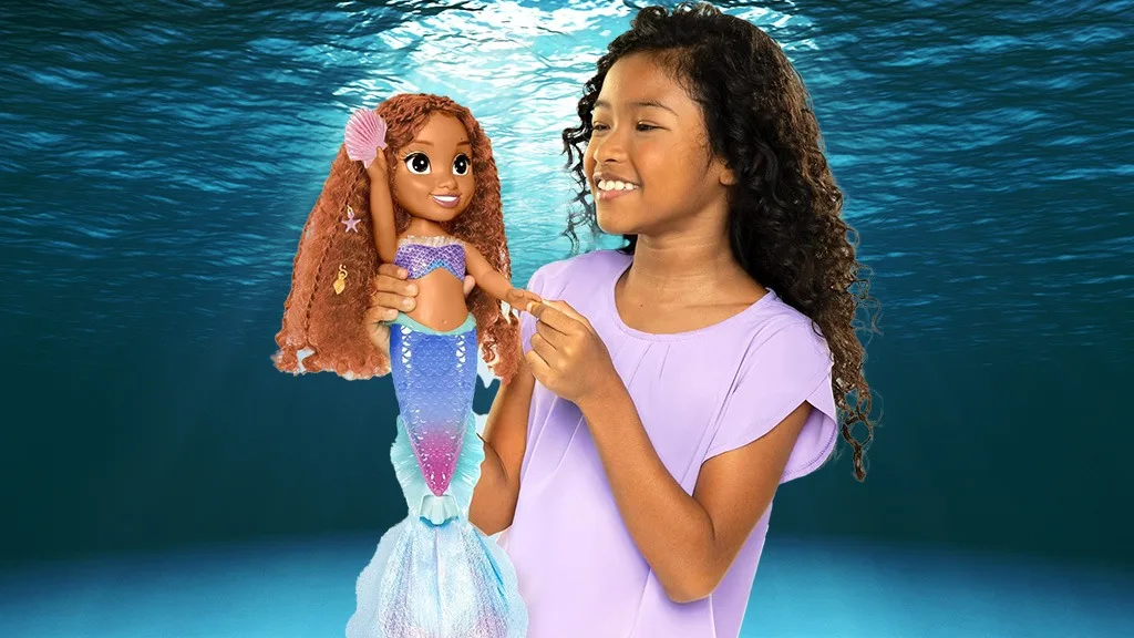 Disney Junior Splash & Glow Ariel lutka od Just Play-a, dizajnirana za djecu od 3 godine i stariju, može se prilagoditi priloženim perlicama za kosu i tijarom. Djeca mogu pritisnuti lutkinu školjkastu ogrlicu kako bi čula zvučne efekte i uvodnu pjesmu iz nove emisije. Kada dođe u kontakt s vodom, Arielin rep svijetli u duginim bojama i prska vodene mlazove u obliku suknje.