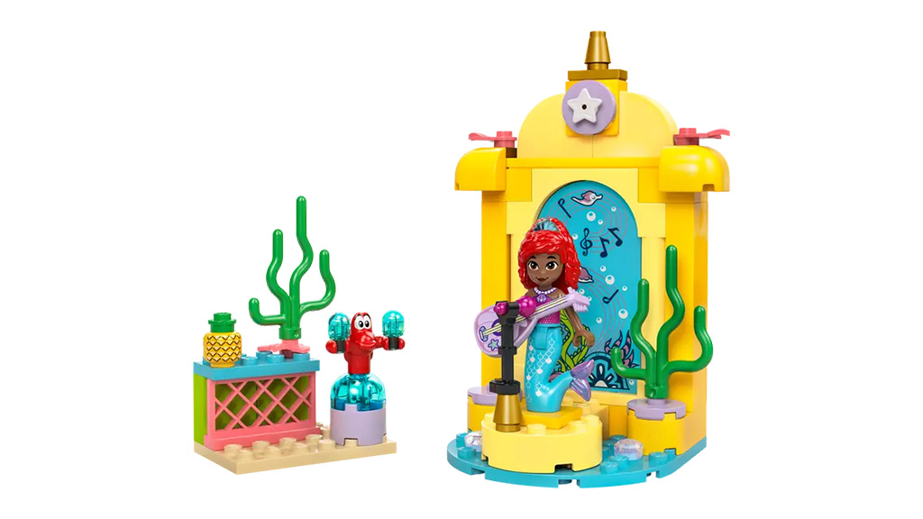 Ovaj set za igru s 141 dijelom sadrži figure Ursule, Ariel i Floundera. Set za igru uključuje špilju s rotirajućom platformom, "vozilo kit" i "olupinu broda". Datum izlaska: 1. srpnja.Pripremi glazbu s Arielom i Sebastianom! Ovaj LEGO set od 60 dijelova sadrži rotirajući plesni podij, kutak za osvježenje i cijelu kolekciju LEGO dodataka. Set izlazi 1. srpnja.LEGO proširuje svoju kolekciju proizvoda Ariel s dva nova seta. Set Arielina kristalna špilja sastoji se od 141 dijela i preporučuje se za male graditelje od 4 godine. Set uključuje LEGO Disney minifigure Ursule i Ariel, kao i LEGO figuru Floundera.