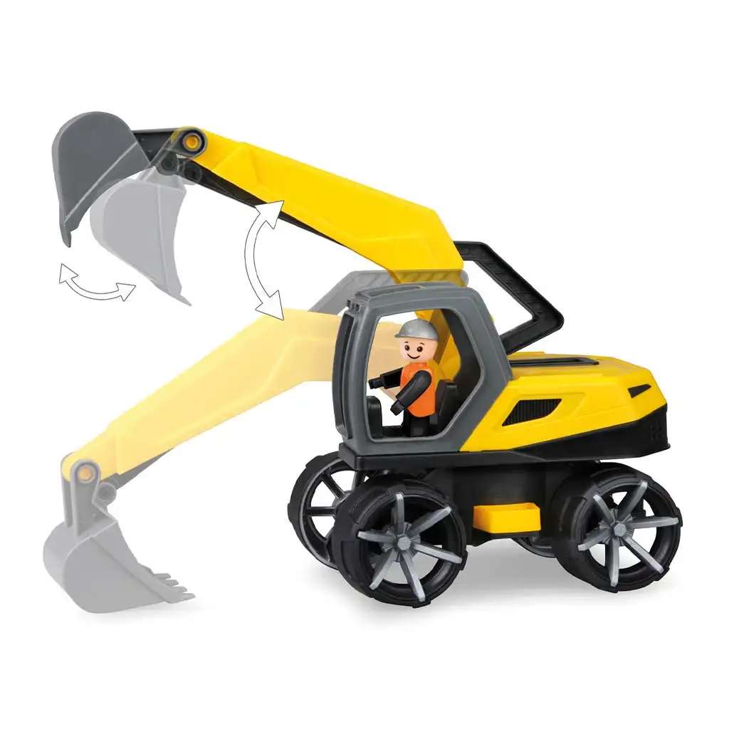 Vozačka kabina je potpuno prilagođena igri, a unutra se nalazi LENA® figurica koja pomaže započeti velike radove. S pomičnom rukom bagra zemljani radovi postaju dječja igra, a podvozje se može zaključati, čime stroj stabilno stoji tijekom igre. Pocinkovane čelične osovine debljine 4 mm jamče dugovječnost, a uz priključak za prikolicu može se dodati još radnih strojeva, prema želji male graditeljske ekipe.