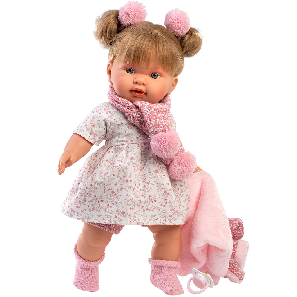Llorens: Alexandra, plačuća lutka visine 42 cm u ružičastom kaputu, prava je očaravajuća igračka koja poziva na brigu i brzo postaje djetetov omiljenac. Lutkino nježno oblikovano lice, sjajne oči i mekani dodir pružaju realističan doživljaj. Haljina s cvjetnim uzorkom, topao i mekani ružičasti kaput te odgovarajući šal pružaju šarmantan, usklađen izgled. Funkcija plakanja i duda omogućuju djetetu da doživi pravu brigu dok razvija empatiju i maštu tijekom igre.