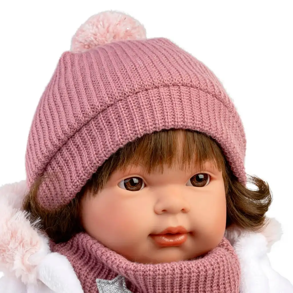 Ako tražite zaista voljenu, stilsku i realističnu lutku, Carla će biti savršen izbor. Llorensova lutka koja plače, visoka 42 cm, dolazi u sjajnoj, plišanoj ružičastoj haljini ukrašenoj sitnim crnim zvjezdastim uzorcima. Zimski izgled lutke upotpunjuje mekana bijela jakna, moderna puderasto ružičasta pletena kapa s pomponom, odgovarajući okrugli šal i grijači za noge – svaki detalj zrači toplinom i šarmom.