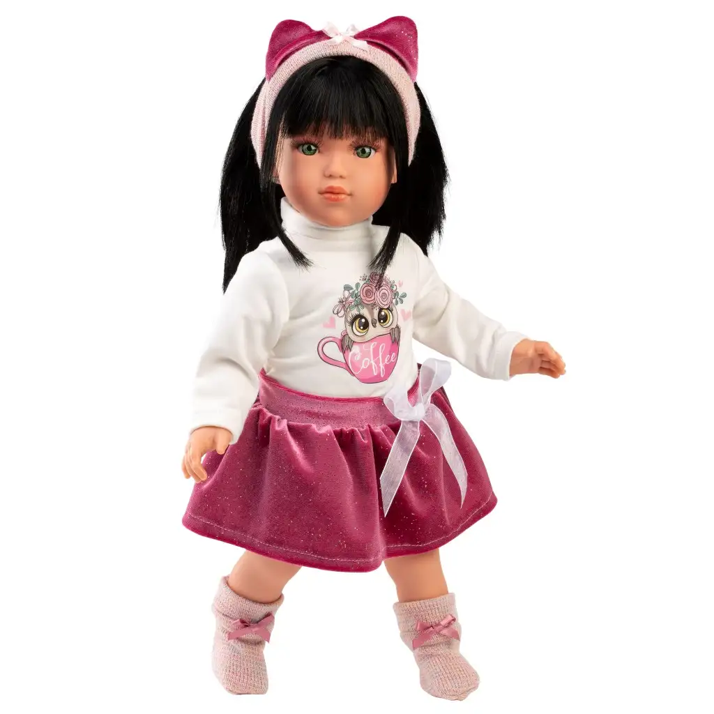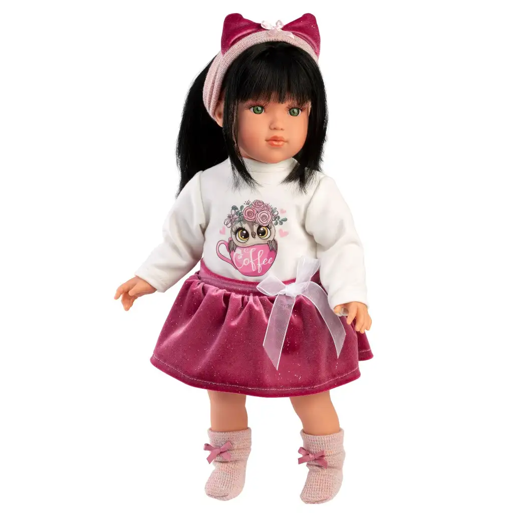 Upoznajte Gretu, 40 cm visoku lutku Llorens koja će svojom očaravajućom osobnošću odmah osvojiti srce vašeg djeteta! Greta ima živopisan izgled i privlačne zelene oči, a nosi stilsku majicu s uzorkom sove i sjajnu ružičastu suknju, što je uvijek trendi izbor u svijetu lutaka. Dodaci poput trake za kosu s mašnom i slatkih, sjajnih cipela dodatno pojačavaju njezin elegantan izgled. Greta ima dugu, svilenkastu crnu kosu koja je pogodna za stvaranje različitih frizura, omogućujući djeci da provedu sate u kreativnom i modnom stiliziranju kose. Svaka lutka Llorens izrađena je ručno, s izuzetnom pažnjom na detalje i korištenjem pažljivo odabranih materijala kako bi zadovoljila najviše standarde kvalitete. Lutka dolazi u prekrasnoj dekorativnoj kutiji, čineći je savršenim izborom kako za djecu tako i za kolekcionare.