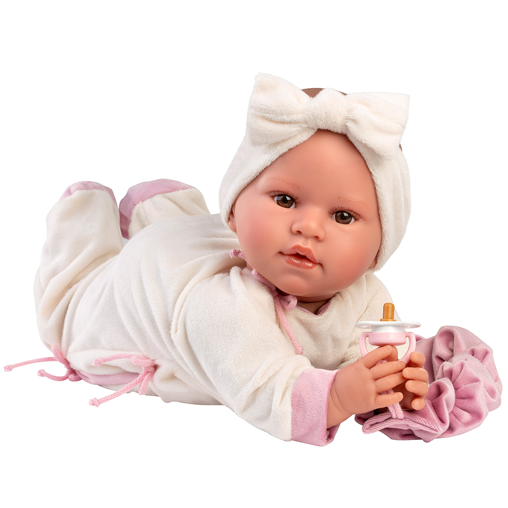 A Llorens: Lea lutka koja plače visine 45 cm u bodiju s motivom koale zaista je šarmantan izbor ako tražite igračku koju će dijete zavoljeti i koja potiče brigu. Lutka nosi mekani kremasti bodi ukrašen slatkim uzorkom koale i nježnim ružičastim detaljima. Uparena traka za glavu s mašnom dodatno naglašava njezin izgled. Realističan izraz lica i detaljna izrada pomažu pri uživljavanju u igre uloga. Lutku koja plače lako je umiriti cuclom, pa dijete može iskusiti radost pružanja brige. Bočica i mekani tekstilni dodatak dodatno obogaćuju igru.