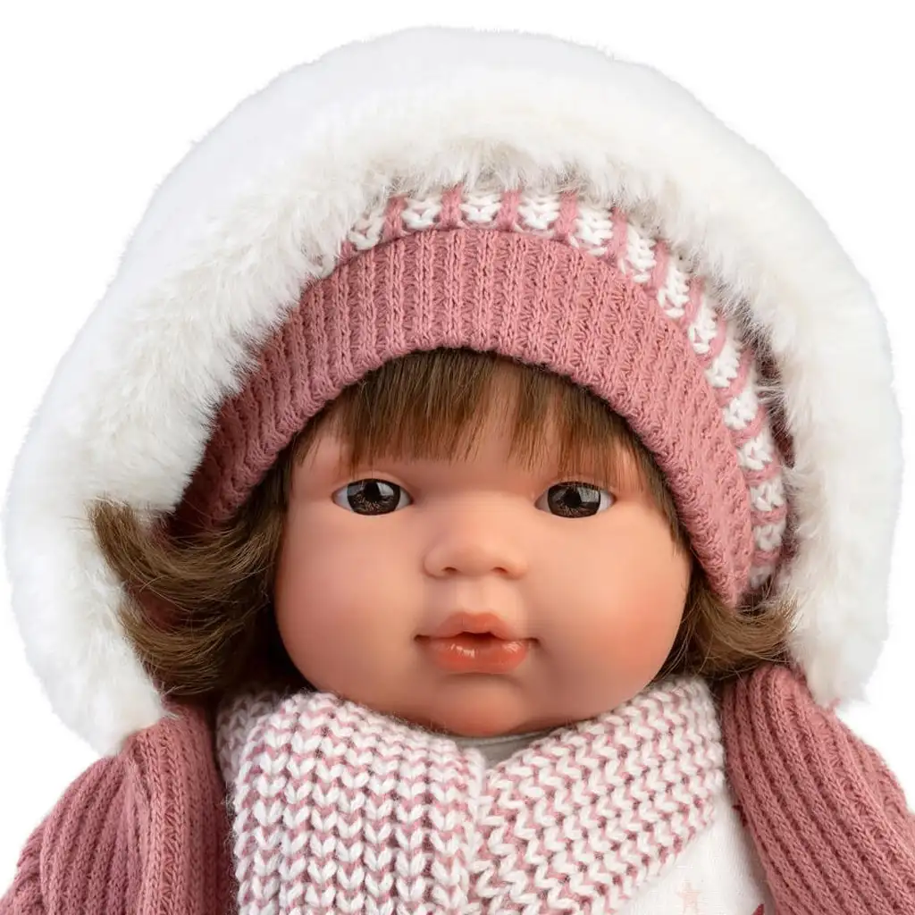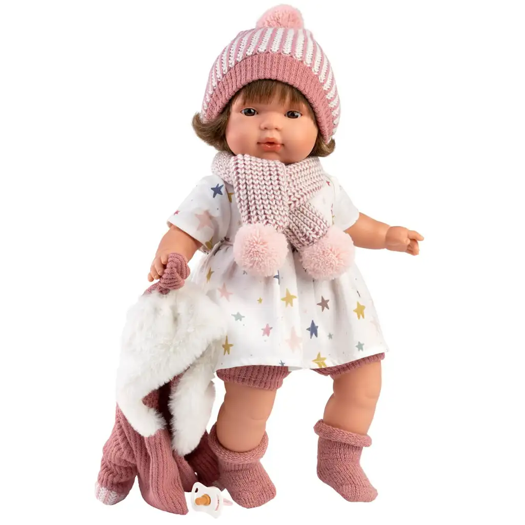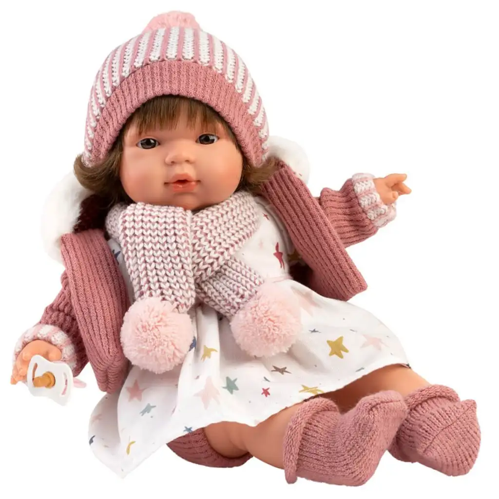 Lola je zaista voljena, 38 cm visoka plačuća beba iz Llorens kolekcije, koja će zasigurno osvojiti srce vaše djevojčice. Njena haljinica sa zvjezdastim uzorkom je razigrano šarena, dajući joj veseli izgled, što već pri prvom susretu izmami osmijeh na lica. Uz haljinu savršeno pristaje puderasto ružičasta pletena kapa s bijelim prugama i pomponom, kao i šal koji završava s dva velika resa, gaćice i tople male čarape. Set uključuje i mekani, bijelim krznom obloženi ružičasti kaput, koji Lola drži u ruci, čineći igru još realističnijom i zabavnijom.