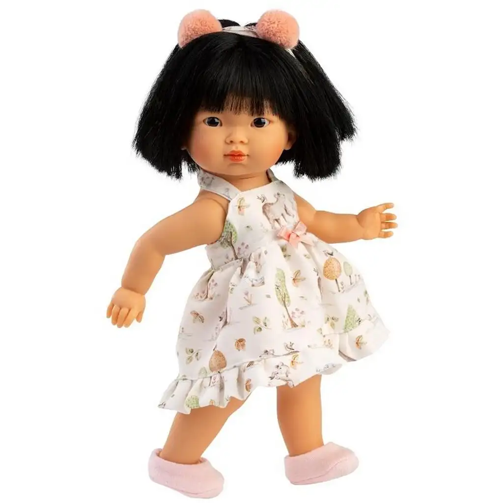 Lu je šarmantna, 28 cm visoka lutka koja je savršena kombinacija šarma i razigranosti. Zahvaljujući svojoj maloj veličini, idealna je za najmlađe koji se igraju s lutkama – lako se drži, grli i može se nositi bilo gdje. Njena traka za kosu s resicama u ružičastoj boji i prirodno ravna crna frizura čine je zaista posebnom i stiliziranom, dok vesela, ljetna haljina s uzorkom životinja osigurava da svaka igra bude radosna.