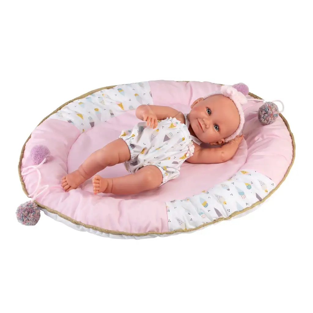 Llorens Nica lutka, koja dolazi s dužinom od 40 cm i očaravajućom haljinom s uzorkom sladoleda, bit će pravi izvor radosti za djecu! Lutka ima životopisnu izražajnost lica i sjajne plave oči koje zrače toplinom, a detalji poput lijepo oblikovanih prstića pružaju impresivnu realističnost. Nica lutka ima plastično tijelo koje osigurava dugotrajnost i lako se čisti, tako da igra može trajati satima u čistom okruženju. Prekrasna posteljica, izrađena od nježne ružičaste tkanine i ukrašena pufastim pomponima, savršeno je mjesto za odmor lutke, dok istovremeno odlično služi kao dekoracija dječje sobe. Svaka Llorens premium španjolska lutka ručno je izrađena s izuzetno detaljnom obradom i izrađena od pažljivo odabranih materijala kako bi zadovoljila najviše standarde kvalitete. Lutka dolazi u prekrasnoj dekorativnoj kutiji, stoga je savršen izbor kako za djecu tako i za kolekcionare.