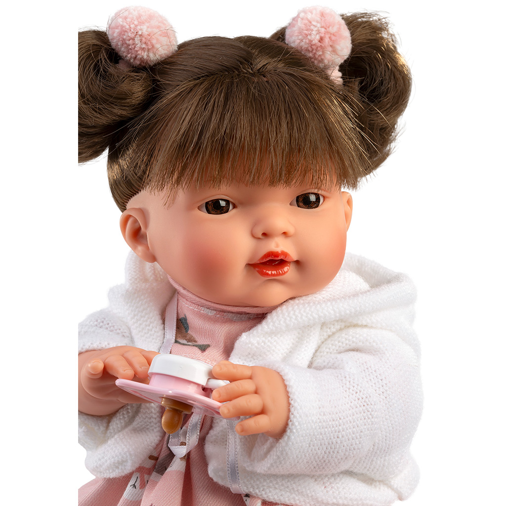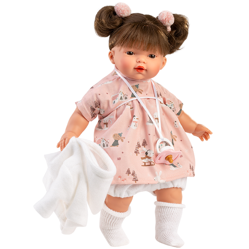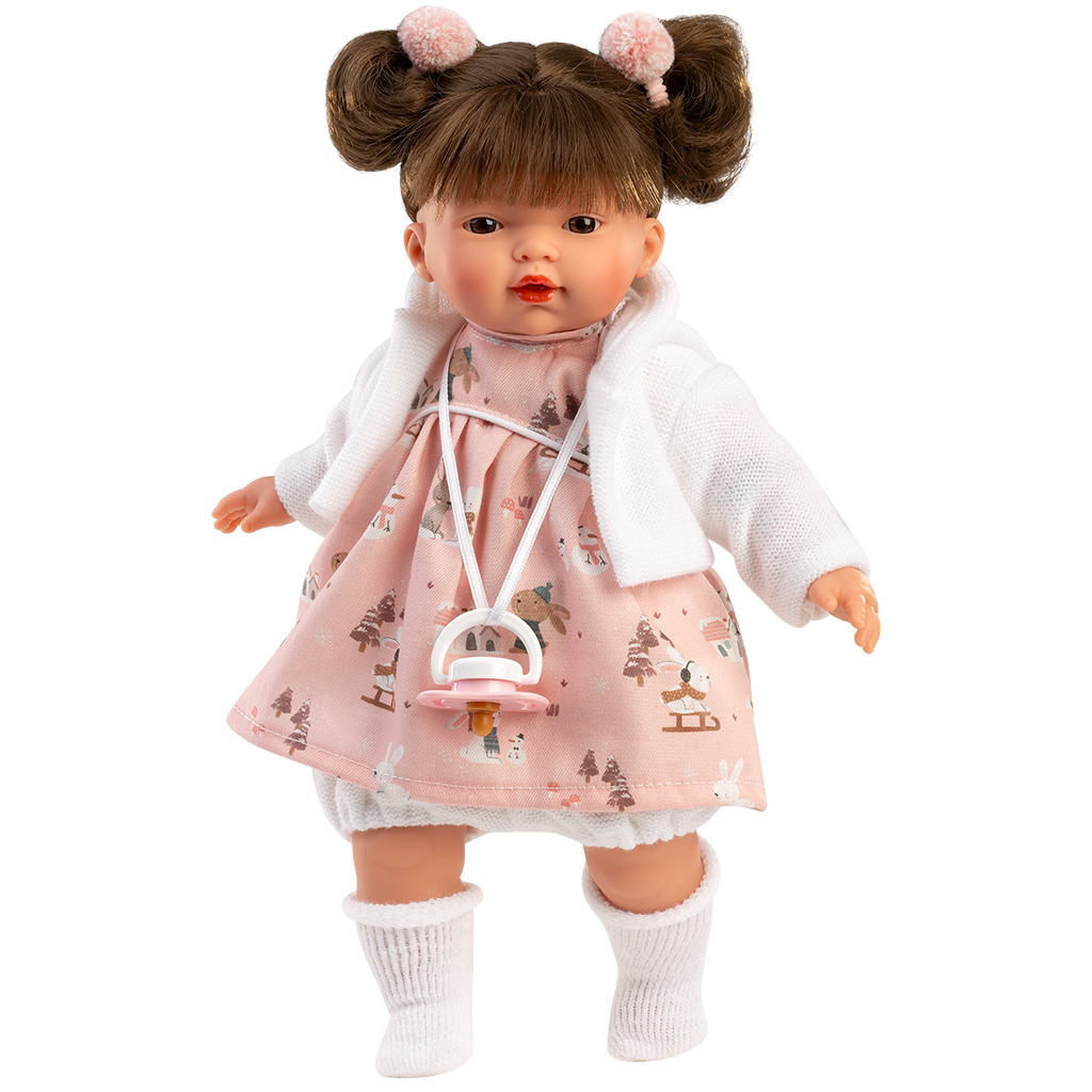 Llorens: Vera lutka u haljinici s motivom zečića je zaista očaravajuća, 33 cm visoka igračka-lutka koja može biti savršen pratitelj tvom djetetu tijekom svakodnevne igre. Nježan, nasmijani izraz lica i detaljna izrada gotovo oživljavaju lutku, čineći brigu u igri uloga još zabavnijom. Fina, pastelnog tona haljinica s motivom zečića i mekani bijeli kardigan daju joj topao, domaći izgled, dok duda čini iskustvo igre još realističnijim. Idealna je za razvoj djetetove mašte, empatije i sposobnosti brige kroz jednu simpatičnu lutku.