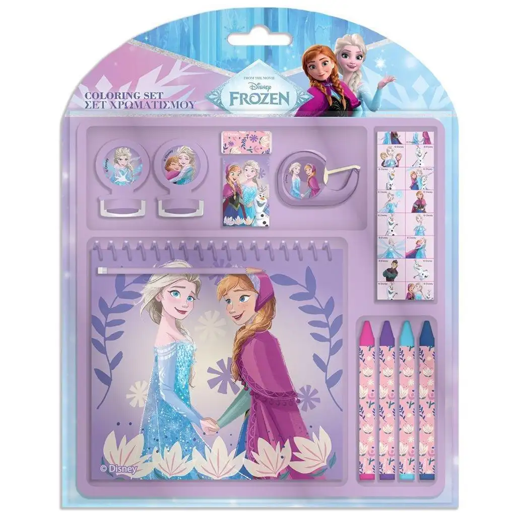 U setu se nalazi sve što je potrebno za kreativno provođenje vremena: prekrasna spirala bojanka, 4 vesele voštane bojice s motivom Snježnog kraljevstva, gumica, šiljilo, dispenzer za dekorativnu traku, pečati i naljepnice. Na stranicama se nalaze lijepi prizori iz bajke s poznatim likovima, koje dijete može obojiti i tako ponovno proživjeti najljepše trenutke filma – stvarajući pritom vlastiti, šareni svijet.