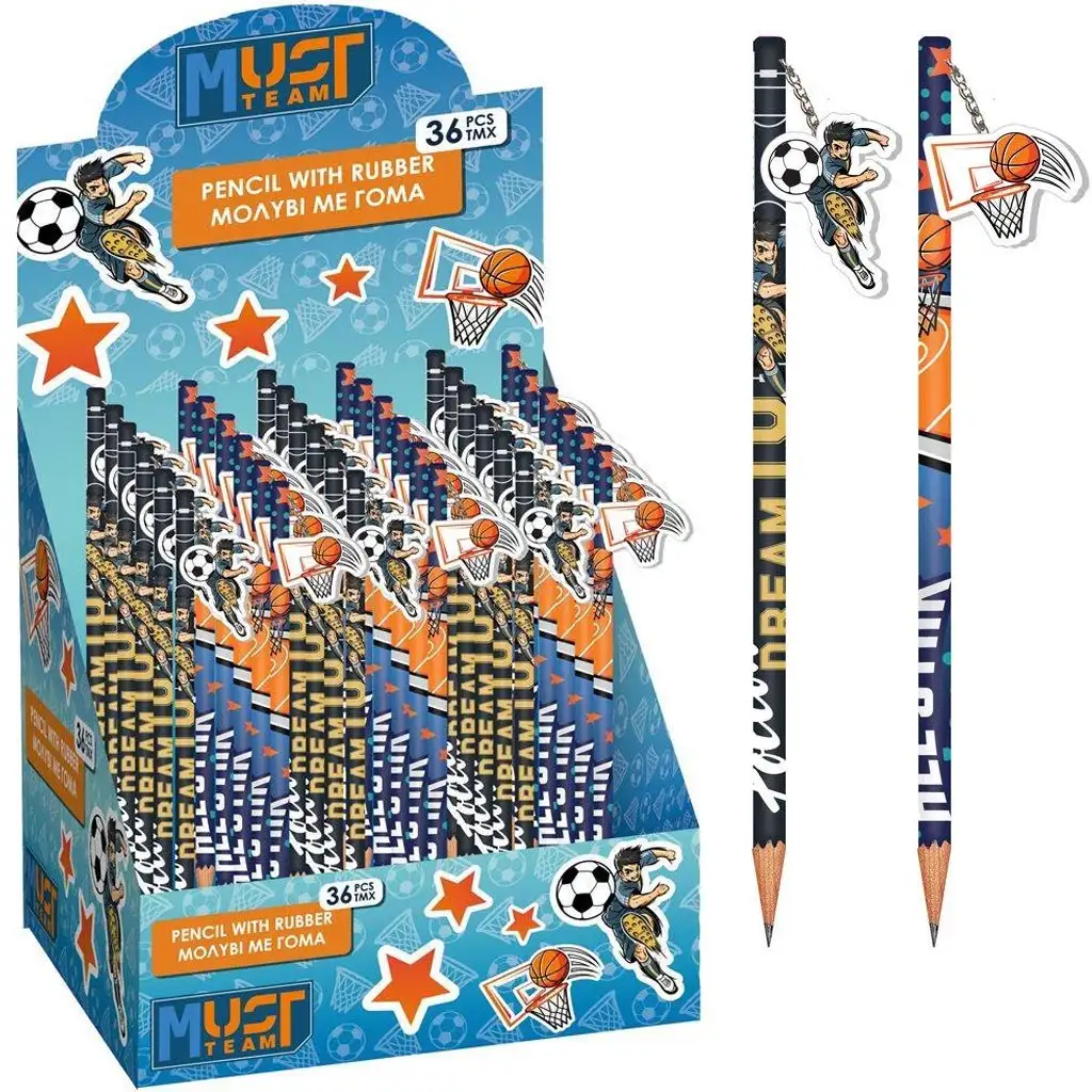 Na kraju olovke, na lančiću, nalazi se gumica u obliku figure – kod jedne varijante to je košarkaški obruč, kod druge nogometaš u akciji – koja je praktična za brisanje grešaka, ali i fora dodatak u pernici. Olovke imaju čvrstu grafitnu jezgru, lako se oštre i udobne su za male ruke.