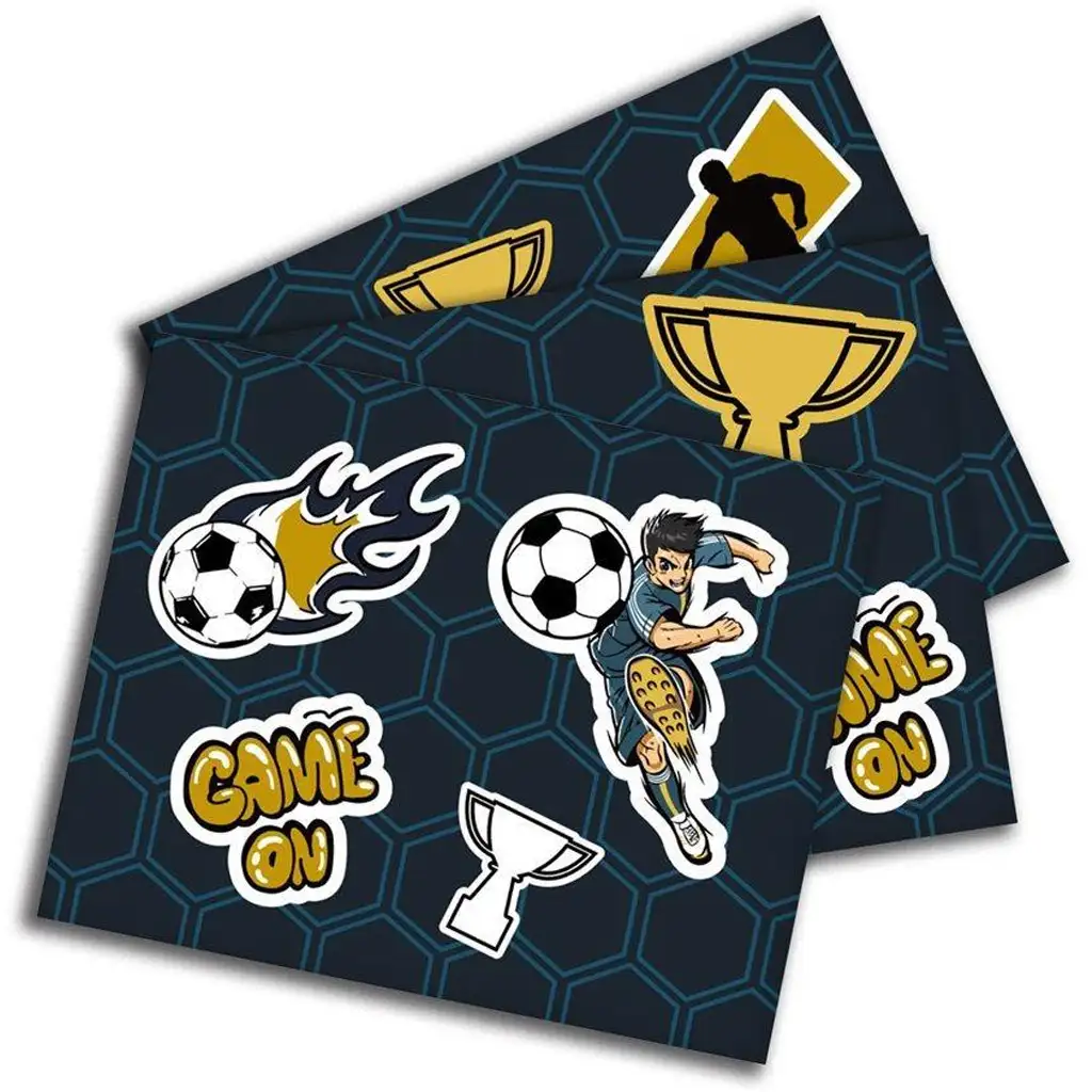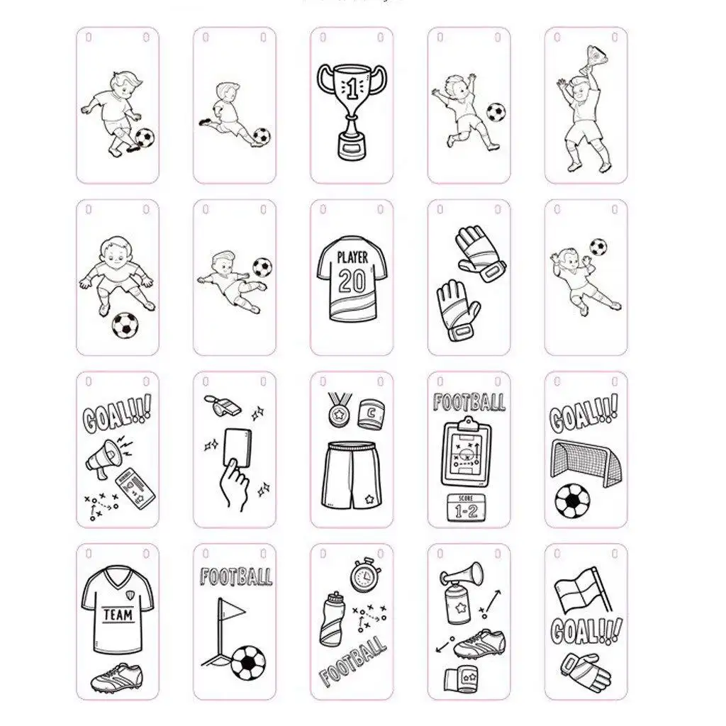 Set sadrži 20 kartica za bojanje s raznim nogometnim scenama, igračima, elementima terena, trofejima i prikazima utakmica – sve čekaju da ih djeca oboje prema vlastitoj mašti. Četiri žive flomaster boje (plava, svijetloplava, zelena, žuta) savršene su za oživljavanje crteža. Zabavu dodatno pojačavaju 3 lista nogometnih naljepnica s loptama, trofejima, igračima i natpisima "Game On".