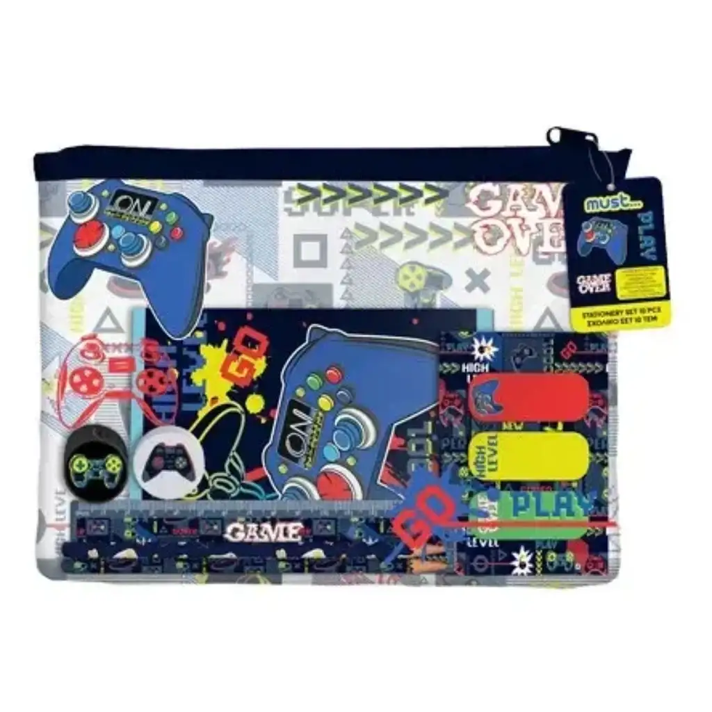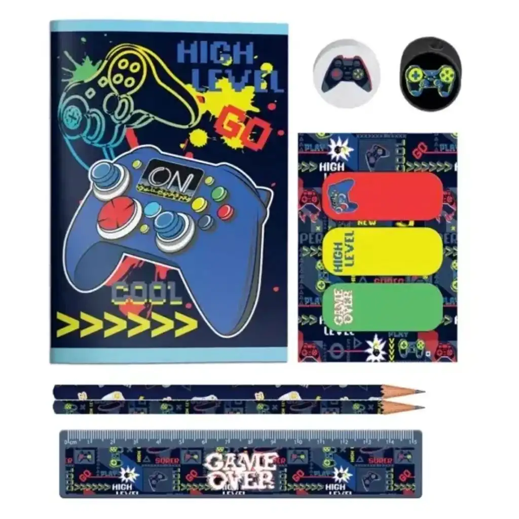 Set sadrži mali notes, dvije grafitne olovke, ravnalo, gumicu, šiljilo i tri šarena označivača za knjige, sve smješteno u izdržljivoj futroli s patentnim zatvaračem. Futrola lako stane u školsku torbu, tako da će svi važni pribori uvijek biti pri ruci. Dizajn s tamnom podlogom i neonskim motivima te grafikom kontrolera daje zaista fora dojam – ovo će obožavati!