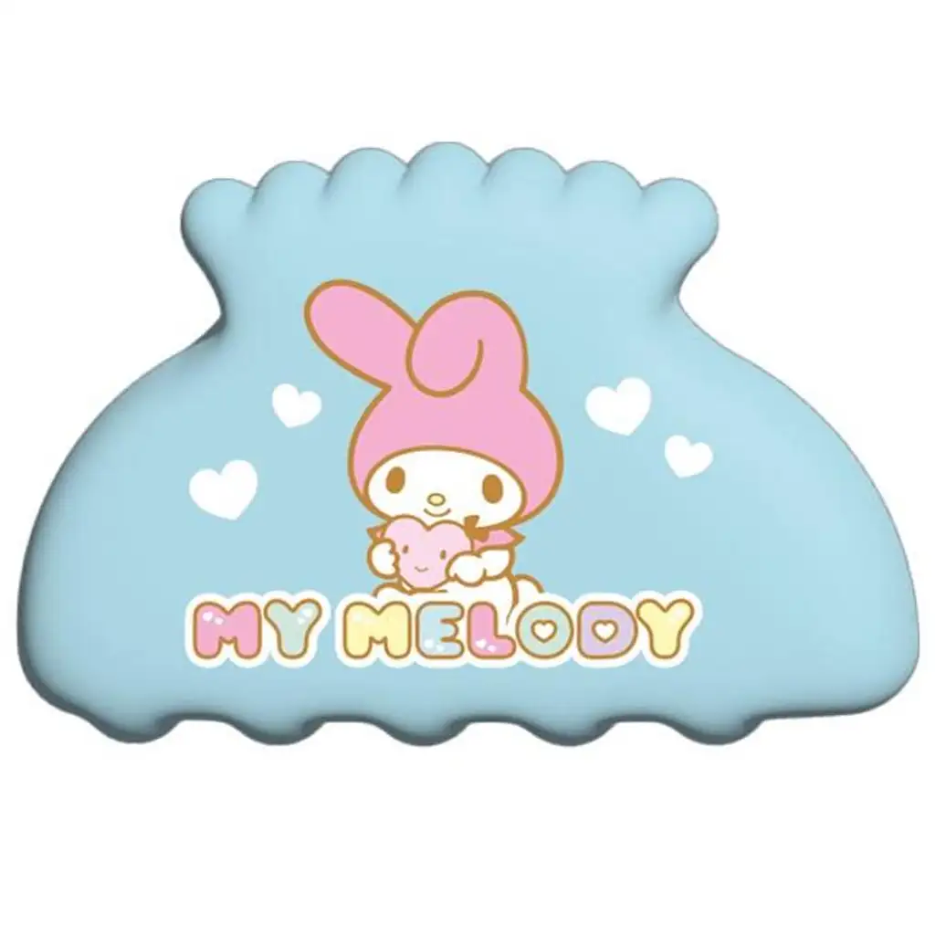 Na sredini kopče nalazi se slatka grafika My Melody kako grli malu plišanu medvjediću, a oko nje su bijela srca i natpis "MY MELODY". Oblik kopče je siguran i udoban, a nazubljeni dizajn dobro drži čak i gušću kosu. Materijal koji je prijateljski za kosu ne čupa ju, pa se može nositi cijeli dan bez nelagode.