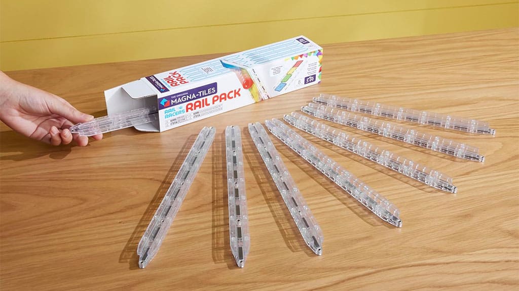Svaka Rail Racers tračnica sastoji se od četiri pločice. Ove tračnice omogućuju izgradnju dužih staza, čime pružaju još uzbudljivije i raznovrsnije iskustvo igre za djecu. Elementi tračnica koji se nalaze u MAGNA-TILES setovima lako se spajaju, tako da djeca mogu oblikovati vlastite željezničke pruge prema svojoj kreativnosti.