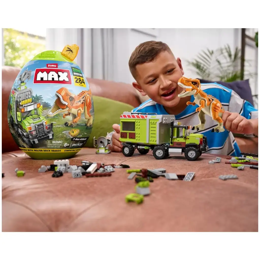 Uroni u divlji svijet dinosaura s najvećim setom MAX Dino Adventure! U kapsuli u obliku jajeta, koja sadrži više od 300 građevinskih elemenata, pronaći ćeš sve što ti je potrebno za uzbudljivu, akcijsku avanturu: ogromnu pomičnu figuru T-Rexa, dva hrabra istraživača, čvrsti terenski automobil s otvarajućom stražnjom stranom i mnoštvo dodatne opreme. Samo sastavi set, upotrijebi maštu i dinosaurova avantura može početi!