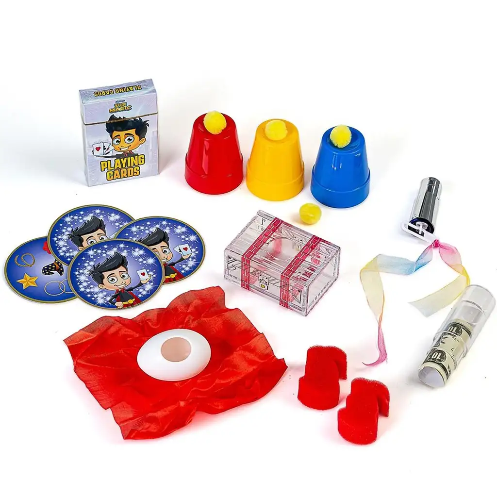 U setu ćeš pronaći rekvizite za nekoliko klasičnih mađioničarskih trikova: šareni trik sa čašom, čarobna cijev za novčiće, tajna kocka, nestajući rubac, špil karata, misteriozna prozirna kutija, posebni diskovi za trikove, kao i svileni rupčić za trik s jajetom. Igračka sadrži i QR-kod, pomoću kojeg možeš pristupiti online video uputama s detaljnim koracima – tako dijete lako može naučiti kako izvesti trikove.
