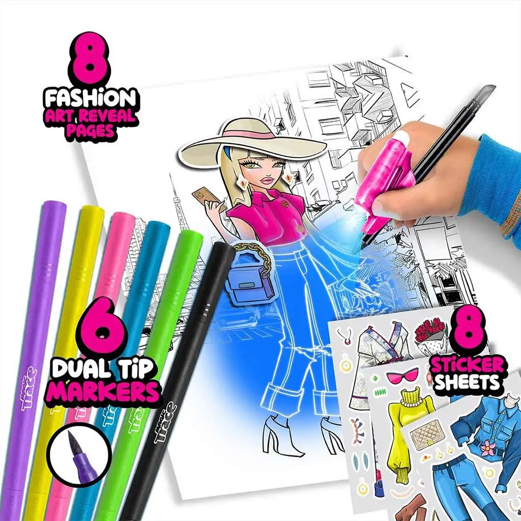 Izradi osam zadivljujućih crteža i otkrij umjetnost stvaranja mode s šest različitih boja dvostranih flomastera, koji omogućuju stvaranje različitih stilova i boja odjeće. Jedan kraj je crn, savršen za konture, dok drugi sjaji u živim bojama - ljubičasta, žuta, magenta, plava i zelena - s kojima možeš stvoriti prava modna remek-djela.