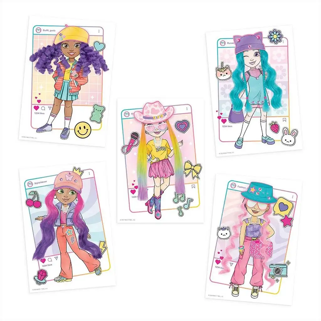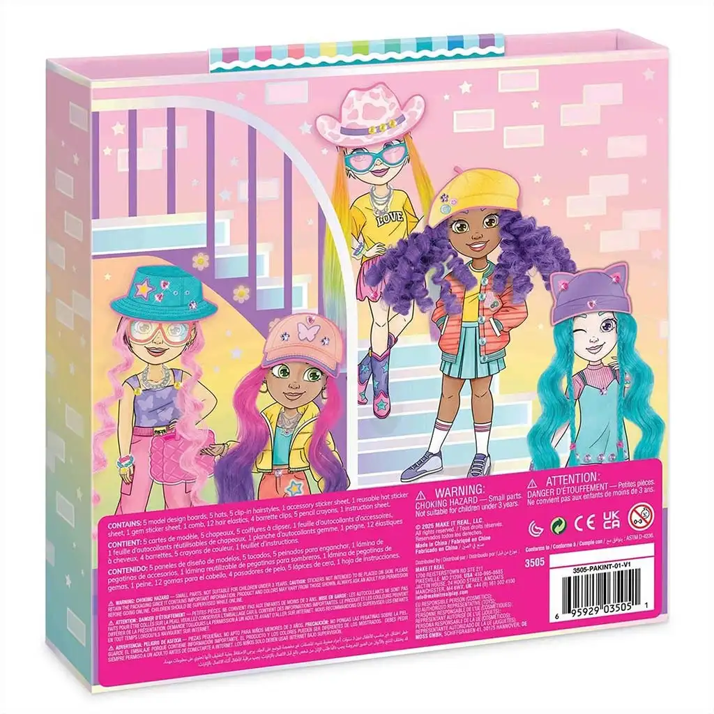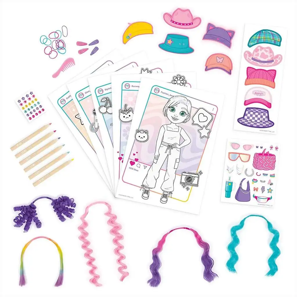 Set sadrži 5 različitih modela na papirima koje djeca mogu personalizirati priloženim šarenim olovkama, naljepnicama i dodacima. Posebno iskustvo pružaju zamjenjivi pramenovi kose u boji koji se mogu pričvrstiti na figure kako bi se isprobale potpuno nove frizure. Uz šešire, sunčane naočale, torbe i druge modne dodatke, svaka kreacija može imati svoj jedinstveni stil – od sportskog, preko boemskog, do ekstravagantnog.