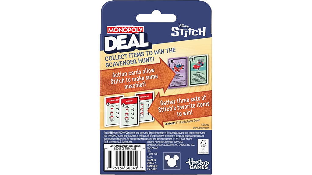 Monopoly Deal: Disney Stitch izdanje je brza kartaška igra koja pruža zabavu cijeloj obitelji. Ova posebna verzija kombinira popularnu igru Monopoly Deal s ikoničnim Disneyjevim likom, Stitchom, čime zajedničko igranje postaje još uzbudljivije i veselije. Tijekom igre igrači mogu koristiti strategiju i sreću dok pokušavaju prikupiti što više nekretnina i pobijediti u partiji. Zbog brzog tempa igre, savršen je izbor za obiteljske večeri ili druženja s prijateljima, jer je zabavna i lako naučiva za sve uzraste.Pobjednik je onaj igrač koji prvi sakupi tri kompletna seta klasičnih Stitch predmeta. Ova igra predstavlja uzbudljiv izazov, jer za pobjedu nije dovoljna samo sreća, već je potrebna i strateška razmišljanja te dobre odluke. Tijekom igre sudionici moraju pratiti poteze protivnika i pametno upravljati prikupljenim predmetima. Onaj tko prvi dosegne tri kompletna seta, postaje pobjednik i osvaja priznanje ostalih igrača.