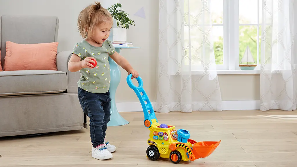 Pogledaj kako šarene loptice skaču iz dimnjaka u žlicu i natrag, dok ovaj buldožer ide naprijed. Mališani mogu čak pritisnuti bočne gumbe kako bi slušali glazbu i učili o bojama i brojevima.