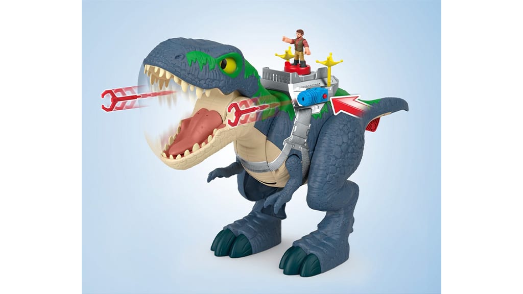 Djeca mogu ispaljivati projektile iz lansirnog paketa. Ova igra pruža uzbudljivu zabavu, miközben razvija spretnost ruku i koordinaciju. Lansirni paket je siguran i jednostavan za korištenje, így djeca mogu samostalno uživati u igri. Izvor: MattelPritisni polugu na kraju repa kako bi figura zagrizla manje igračke! Ova funkcija čini igru još uzbudljivijom i interaktivnijom, hisz djeca tako lako mogu odglumiti scene lova ili napada. Mehanizam koji je dizajnirao Mattel jednostavan je za korištenje i još zabavnijim čini doživljaj igre.