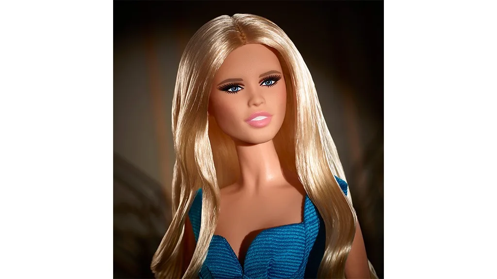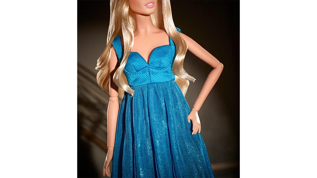 Lutka evocira ikonični trenutak na pisti Claudije Schiffer s jesensko/zimske revije Atelier Versace iz 1994. Duga haljina u boji mora eterealna je i stvara nježan sjaj iz svakog kuta. Izgled je savršeno upotpunjen odgovarajućim štiklama, njezinim poznatim plavim pramenovima i nježnom šminkom.