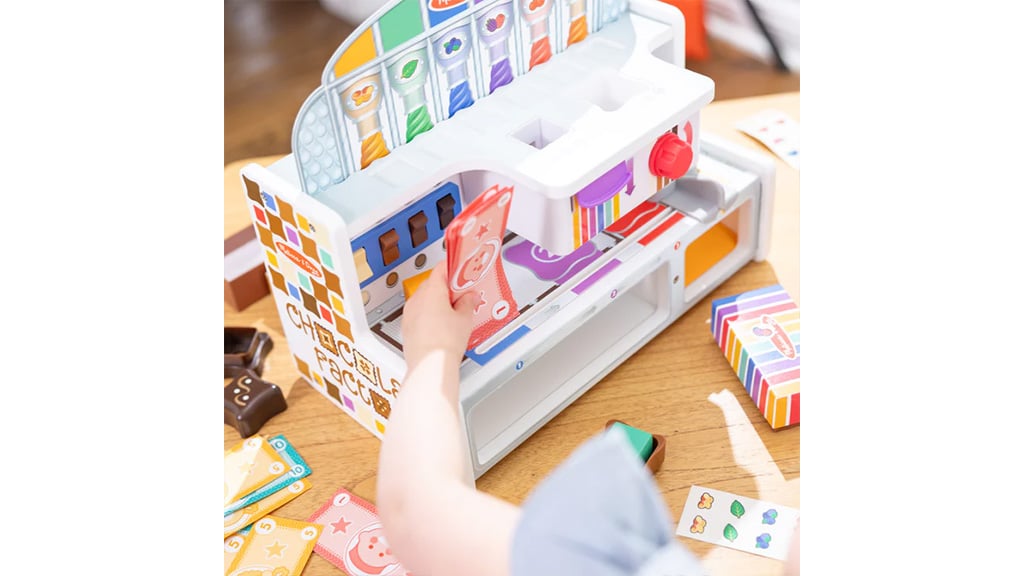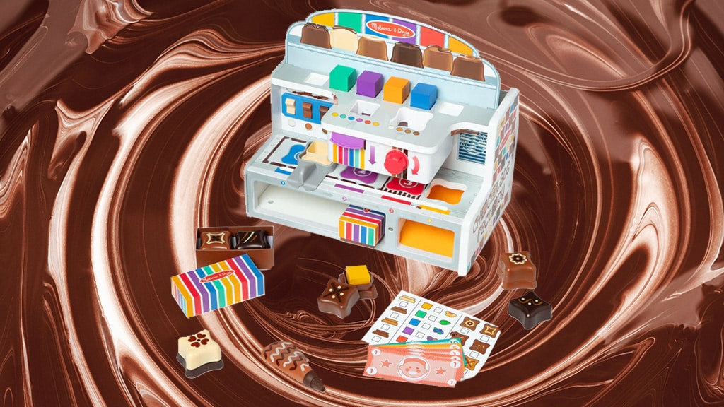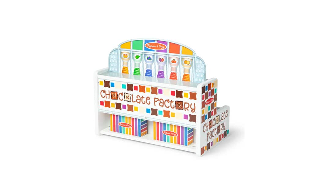 Melissa & Doug tvornica čokolade potiče djecu na maštovitu igru uz pomoć tvornice slatkiša i trgovine slatkišima. Djeca mogu miješati i kombinirati plastične ljuske bombona, preljeve i punjenja uz pomoć pokretne trake, prekidača, poluga i kotačića kako bi bomboni došli na svoje mjesto. Set sadrži šest baza, poklopce, šarene kocke, dvije poklon kutije, cijevi, ploče, karticu s aktivnostima i igraći novac. Djeca mogu izrađivati vlastite bombone, ispunjavati i obrađivati narudžbe. Ova igra nije samo zabavna, već razvija kreativnost i fine motoričke vještine dok djeca uče kombinirati boje i oblike te osnove poslovnog razmišljanja. Tijekom igre djeca mogu iskusiti i radost timskog rada dok zajednički rade na izradi bombona i ispunjavanju narudžbi.