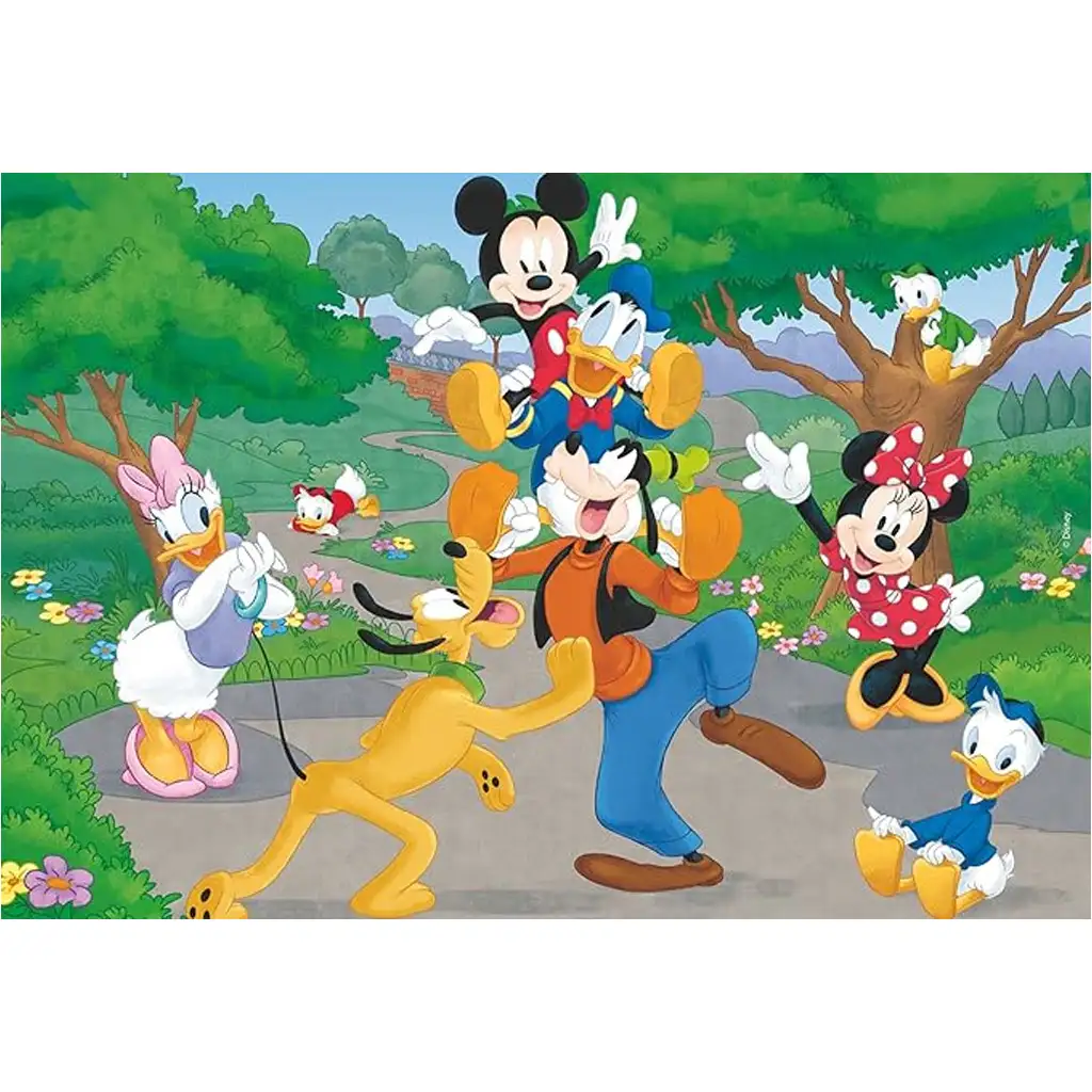 Otkrij svijet Mickeyja Mousea i njegovih prijatelja s ovom šarenom, dvostranom maxi slagalicom koja sadrži dvije odvojene slike od po 12 dijelova i dvije vesele bojanke! Slagalice su veličine 50×35 cm, što ih čini upečatljivima i jednostavnima za rukovanje čak i za najmanje ruke. Na slikama se nalaze Mickey, Minnie, Donald, Daisy, Goofy i Pluto, koji su prikazani tijekom sunčane šetnje ili razigrane avanture – puni energije i dobrog raspoloženja.