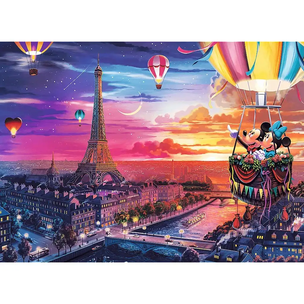 Dopusti da te Mickey i Minnie odvedu u grad romantike s ovom prekrasnom slagalicom od 1000 dijelova! Slagalica „Disney – Mickey i Minnie u Parizu” prikazuje čarobnu večer u gradu svjetlosti: par prelijeće nebo u balonu na vrući zrak, u sjaju zalazećeg sunca, dok ispod njih Pariz, s predivnim zgradama uz obalu Seine i blistavim Eiffelovim tornjem, sjaji u punom sjaju. Boje na slici su tople, ugodne, prepune balona, zvijezda i bajkovite atmosfere.
