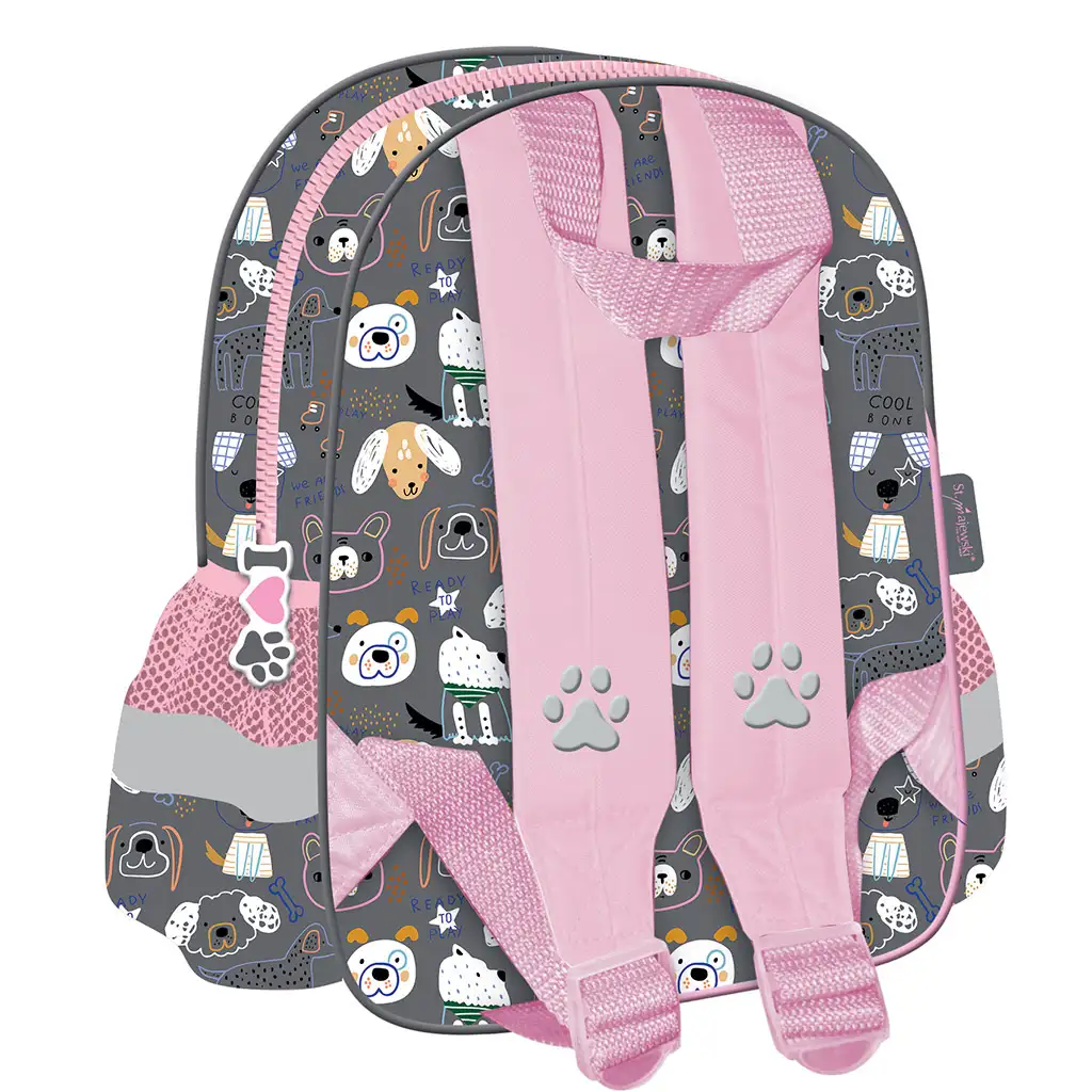 My Little Friend Sweet Pomeranian dječji vrtićki ruksak s motivom psa, dimenzija 28x25 cm, savršen je izbor za sve male ljubitelje životinja u vrtiću. Ovaj slatki ruksak svojim veselim, razigranim dizajnom i slikom prijateljskog pomeranca zasigurno će oduševiti djecu. Rozo-sivoj paleti boja dodatnu čar daju simpatične privjeske za patentne zatvarače u obliku šapica i uzorci s psićima, što ruksaku iz svakog kuta daje šarmantan izgled. Vesele slike pasa i srčeka sigurno će razveseliti mališane tijekom vrtićkih dana.