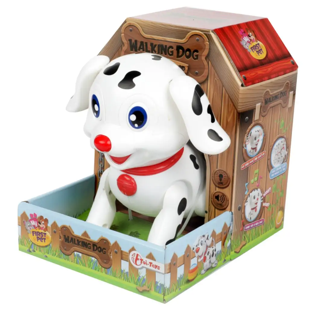 Ovaj slatki mali dalmatinac odmah će osvojiti srca djece! Moj prvi interaktivni dalmatinski psić veselo se kreće, laje, svira glazbu, a uši mu svijetle tijekom igre. Savršen je izbor za one najmlađe koji su još premali za pravog kućnog ljubimca, ali žele imati slatkog malog prijatelja. Ovaj interaktivni psić ne samo da zabavlja, već razvija osjetila i pažnju, dok istovremeno izmamjuje mnogo osmijeha. Šetnja s malim dalmatincem može početi!
