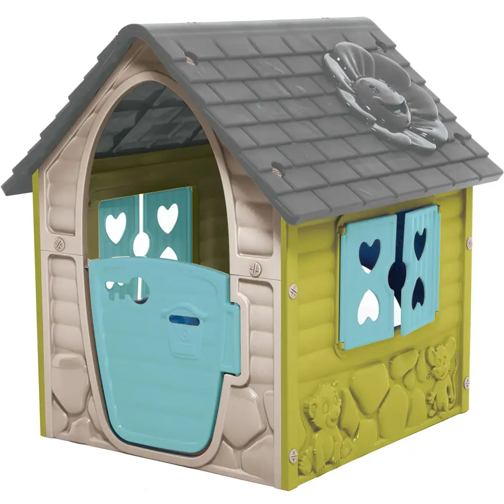 Kućica ima prijateljski i veseo dizajn: poluvisoka vrata koja se otvaraju s ručkom, prozori s roletama u obliku srca i ukrasni krov na kojem se nalazi osmijehnuti cvijet. Sa strane zidove krasite reljefi slatkih životinjica, što igru čini još primamljivijom. Čvrsta, otporna na vremenske uvjete, plastična konstrukcija sigurna je i izdržljiva, tako da je bez brige možete postaviti i u vrtu, tijekom cijele godine.