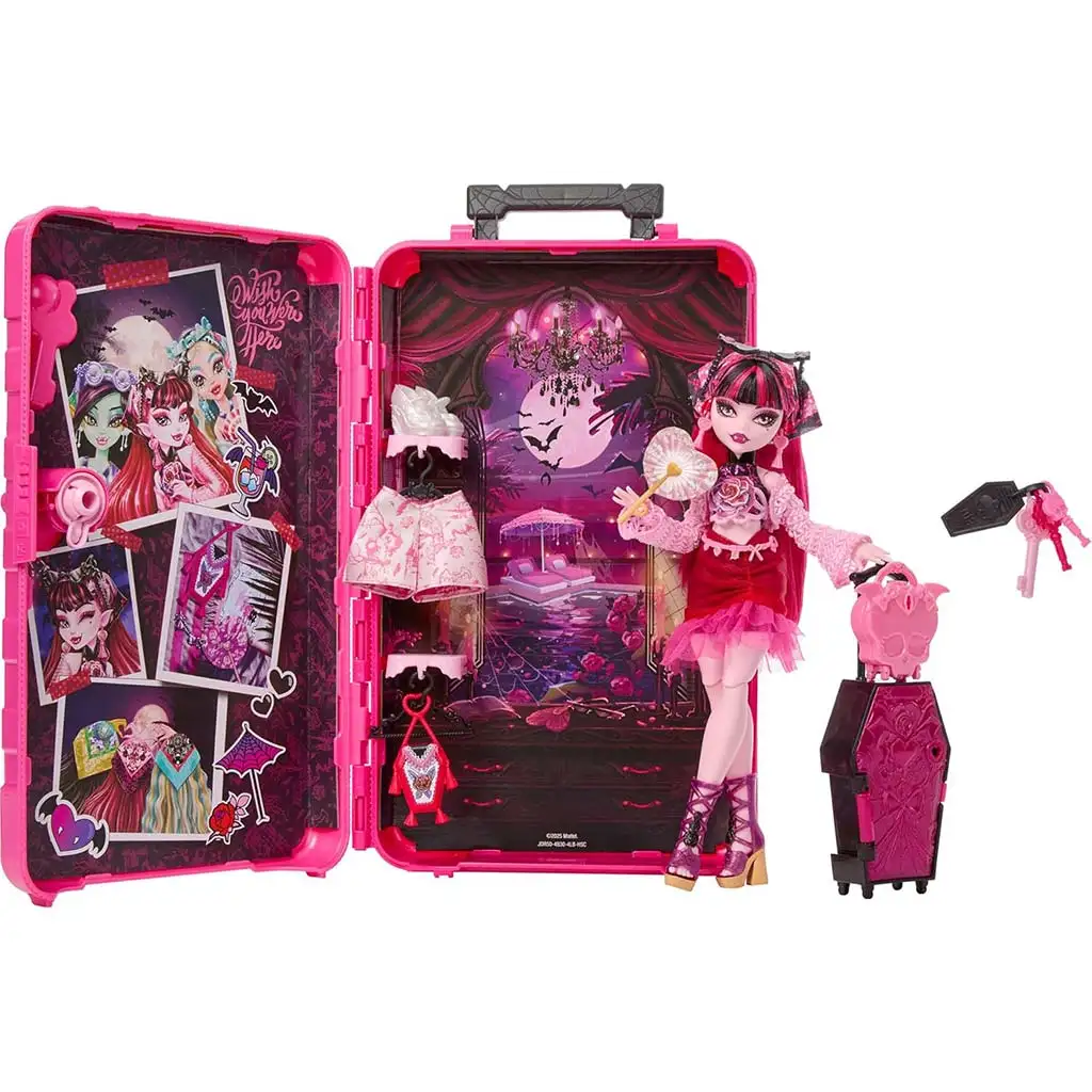 Draculaura je u ovom setu spremna za putovanje, ali i dalje očaravajuće strašna. Njena ružičasto-crna odjeća, detaljno izrađene cipele i upečatljiva šminka savršeno se uklapaju u Monster High svijet. Frizura i izraz lica lutke posebno su detaljni, pa je igra uloga još realističnija. Unutrašnjost kovčega služi ne samo kao prostor za pohranu, već se pretvara u ugodnu „strašno lijepu“ scenografiju koja inspirira pripovijedanje priča i maštovitu igru.