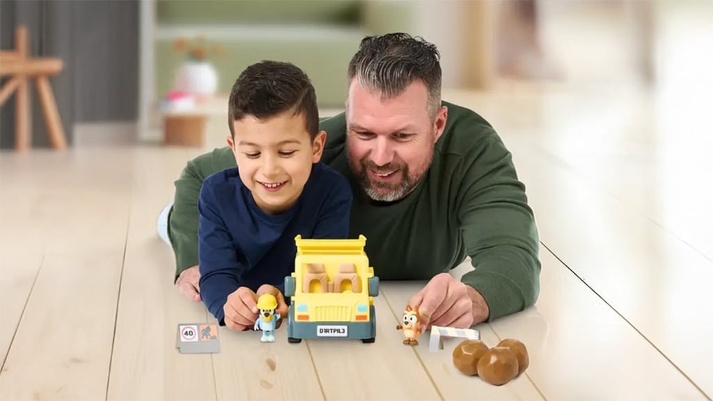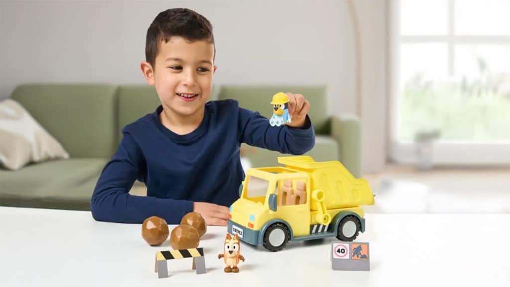 Blueyjev kamion dolazi s figuricom Blueyja s cilindrom, Blatnim Bingom, listom naljepnica, preprekom, znakom "radovi u tijeku" i tri stijene koje djeca mogu utovariti i istovariti povlačenjem poluge. Ova igračka nije samo zabavna, već također razvija finu motoriku i kreativnost djece dok uranjaju u svijet mašte. Različiti elementi omogućuju djeci da izmisle vlastite priče i ponovno kreiraju omiljene scene iz serije Bluey. Igračka je idealan izbor za svako dijete koje voli avanture i igre uloga.