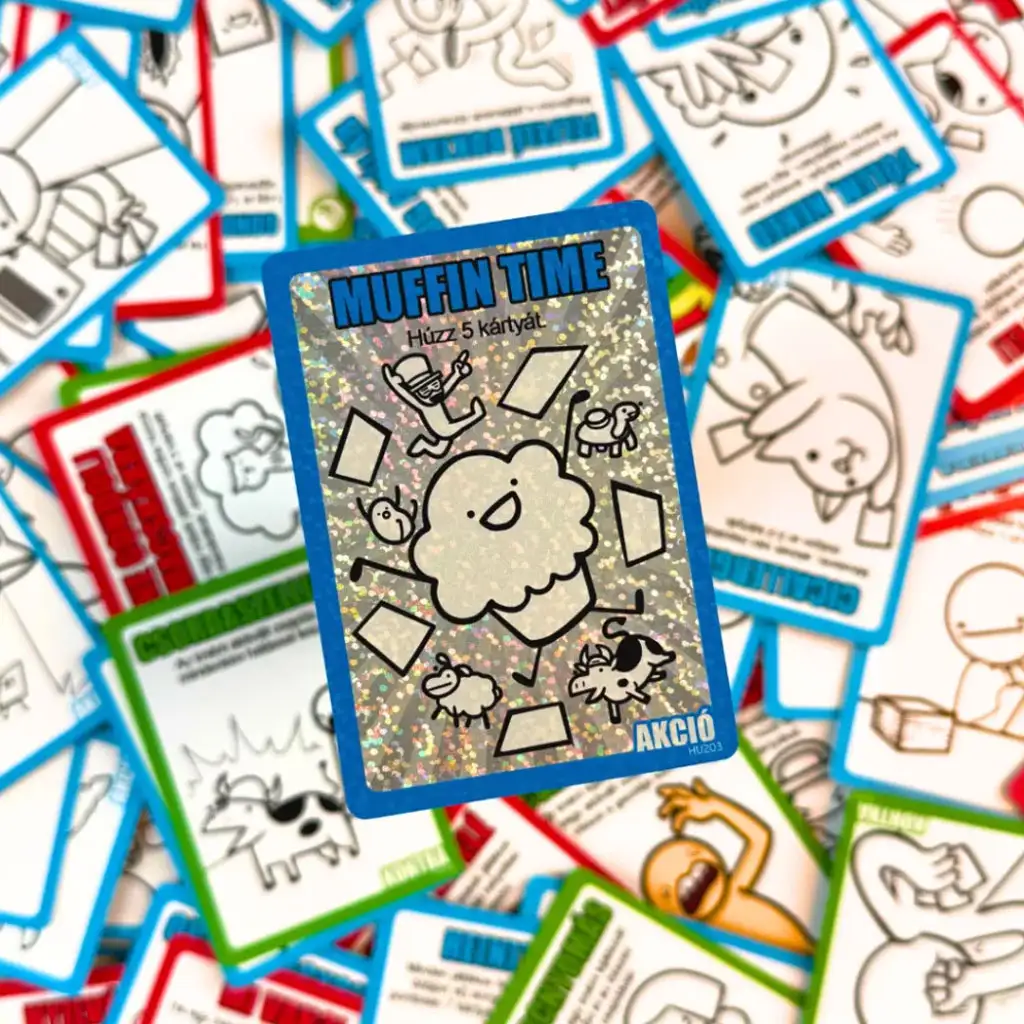Muffin Time sadrži 200 posebnih karata (uključujući i sjajnu, šljokičastu Muffin Time akcijsku kartu), te koristi tri vrste karata: akcija, kontra i zamka. Kombiniranjem tih karata ne samo da možeš sabotirati tuđe planove, već možeš donijeti i iznenađujuće preokrete u igri – čak i uvesti potpuno nova pravila! Izvrstan je izbor za druženja s prijateljima, obiteljske večeri, ili ako se jednostavno želite dobro nasmijati.