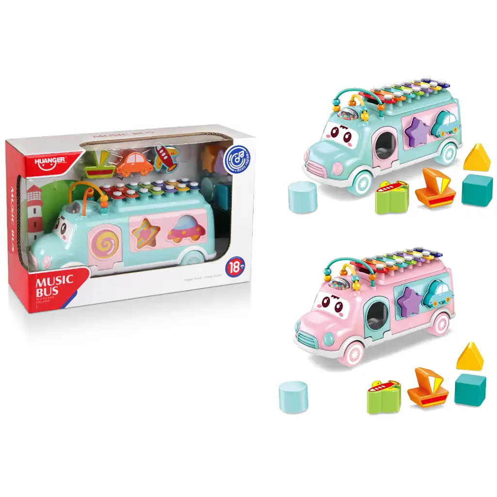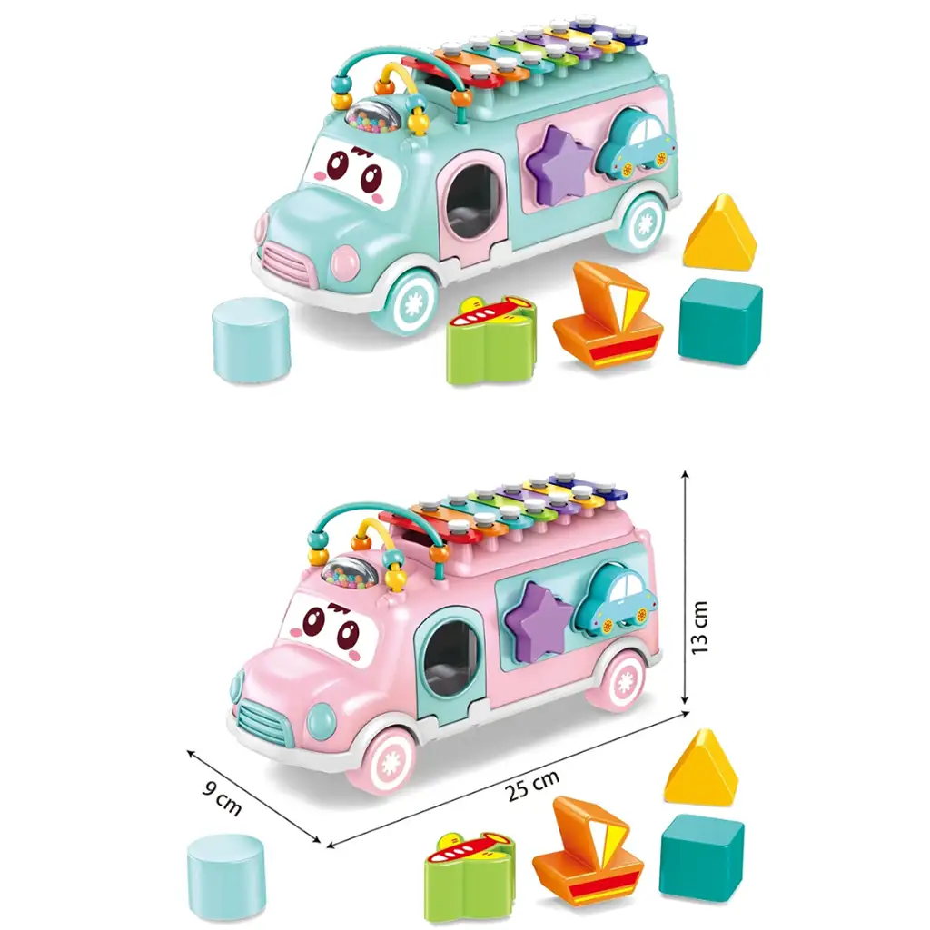 Na prednjem dijelu autobusa nalaze se zvono i vodič za kuglice, a na njegovoj strani nalazi se otvor za ubacivanje oblika koji pomažu djeci razviti fine motoričke sposobnosti i spretnost ruku. Ove igračke potiču mališane na prepoznavanje oblika i razvoj sposobnosti rješavanja problema.