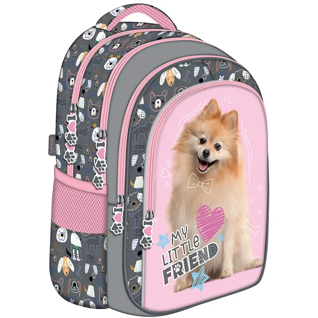 Školska torba, ruksak My Little Friend Sweet Pomeranian sa psom BPL58 veličine 40x29x19 cm savršen je izbor za svakog osnovnoškolca koji voli pse. Dizajn ruksaka krasi nasmiješeno lice šarmantnog pomeranskog psa, koje upotpunjuju vesela srca i zvjezdice na ružičastoj i sivoj podlozi. Bočne strane i naramenice torbe ukrašene su šarenim uzorcima pasa, što ruksaku daje zaista prijateljski i veseo izgled.