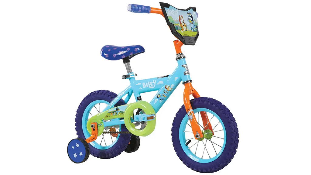 Ovaj 12-inčni bicikl sjaji u živopisnoj kombinaciji plave, zelene i narančaste boje, i prepun je grafika inspiriranih Blueyem. Djeca mogu učiti voziti bicikl s odvojivim pomoćnim kotačima i lako upotrebljivim kočnicama s protupotiskom.