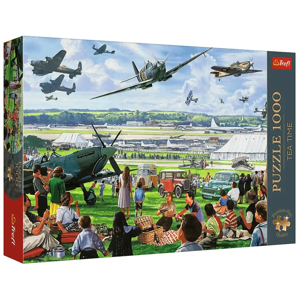 Poletite natrag u prošlost u doba kada je letenje još uvijek bilo pravo čudo! Puzzle od 1000 dijelova pod nazivom „Zračni spektakl – Nostalgijski dan letenja” iz serije Tea Time prikazuje prizor iz davnih vremena: obitelji koje piknikuju, vintage automobile i zadivljujuće klasične avione na aeromitingu. U pozadini se naziru hangari i piste, dok legendarni ratni avioni paraju oblake na nebu. Prava vremenska kapsula za ljubitelje letenja – kako djecu, tako i odrasle.