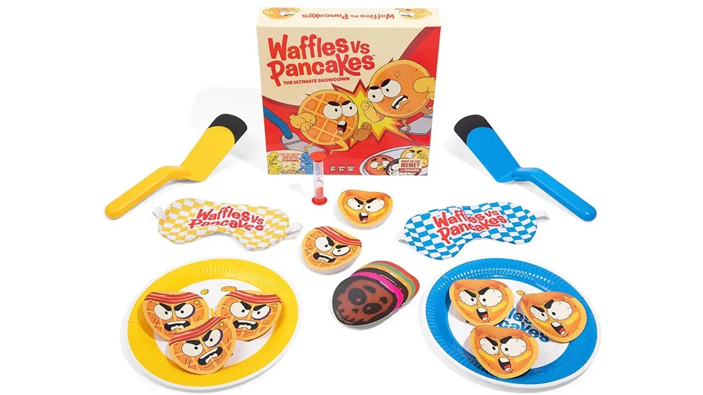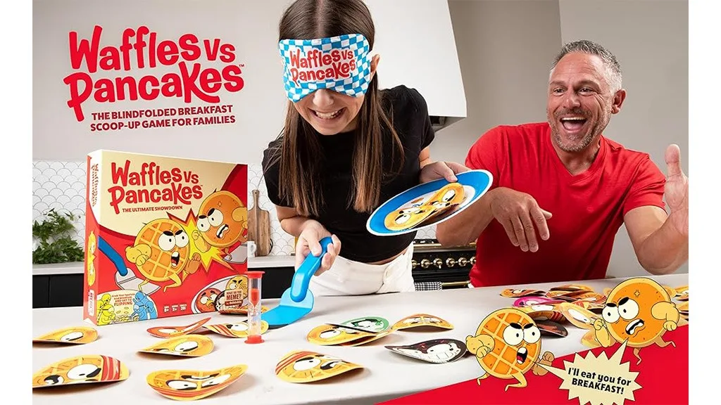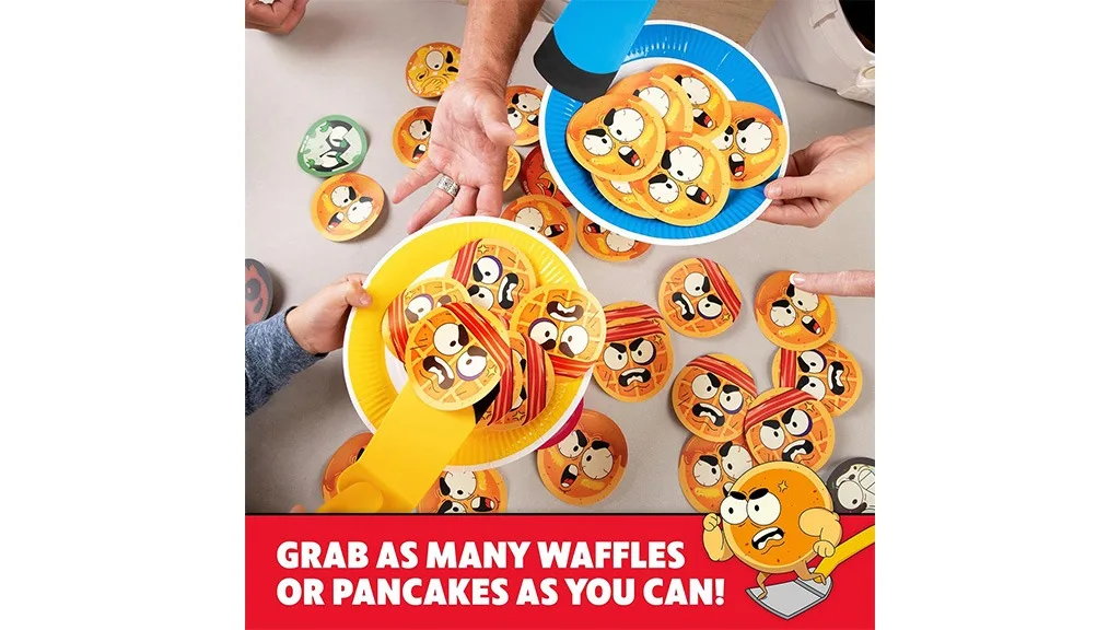 Ukupno, igra Waffles vs Pancakes je fan-flipping-tastic igra za cijelu obitelj za igračku večer.Ovo jutarnje natjecanje u ovoj blagdanskoj sezoni je Vafli protiv Palačinki! Igrači biraju stranu, hvataju špatulu i stavljaju povez na oči. Zatim se utrkuju da napune svoje tanjure vafli ili palačinki! Skupljajte bonus Ratnik Hrane Karte i izbjegavajte Potpuno Izgorjelu Kartu! To je nezaustavljivo uzbudljiva bitka, puna zabave za sve...