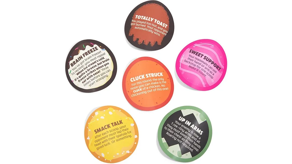 Karte Food Fighter pružaju dodatne izazove za tebe ili drugi tim, čime se pojačava iskustvo igre. Nekarte mogu biti stvarno slatke, dok te druge mogu dovesti u ljepljivu situaciju. Na primjer, dobio sam kartu Cluck Stuck, prema kojoj sam u tom krugu mogao samo oponašati kokodakanje kokoši. S druge strane, karta Totally Toast povećava ulog. Ako ta karta ikada dođe na tvoju stranu stola, krug se automatski završava i drugi tim pobjeđuje taj krug.