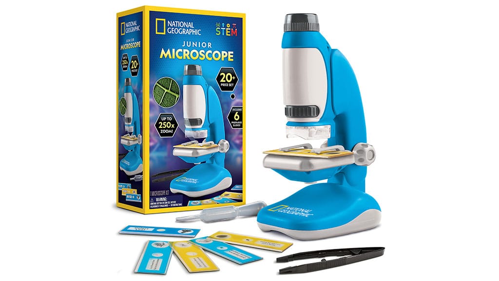 Ovaj mikroskop s 250-strukim povećanjem, gornjim i donjim osvjetljenjem te uklonjivim okularom. Djeca mogu sakupljati vlastite uzorke ili koristiti šest unaprijed pripremljenih biljnih presjeka kako bi izbliza proučavala, na primjer, pelud bora, sjeme maslačka i mnoge druge zanimljivosti. Ovaj mikroskop je idealan alat za otkrivanje prirode i razvoj znanstvene znatiželje, dok djeca na razigran način uče o čudima mikroskopskog svijeta.